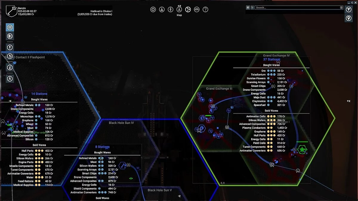 Для таких игроков есть простой выход — поставить несколько спутников (satellites) вокруг интересующих станций и, таким образом, получать всю информацию о торговле в реальном времени. Стоимость спутников намного дешевле, но их придется вручную расставлять, то есть летать к этим станциям