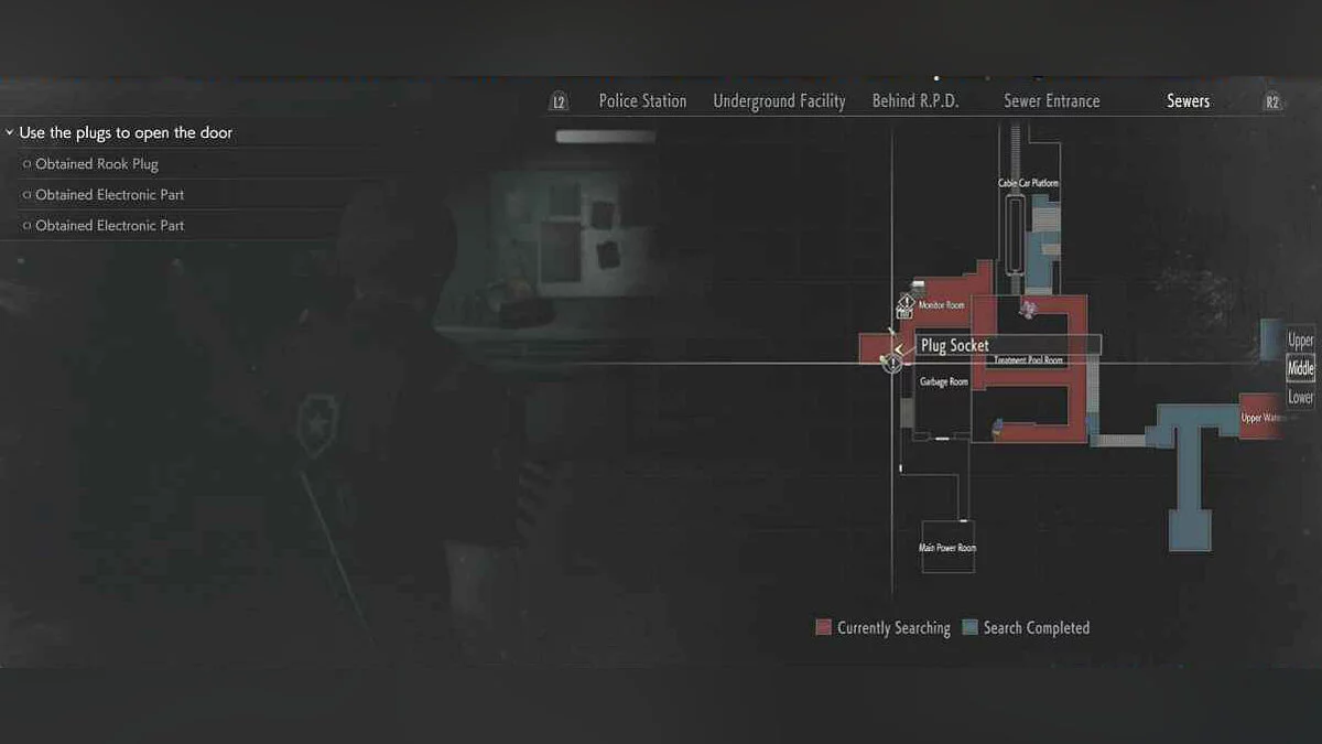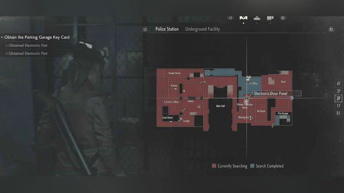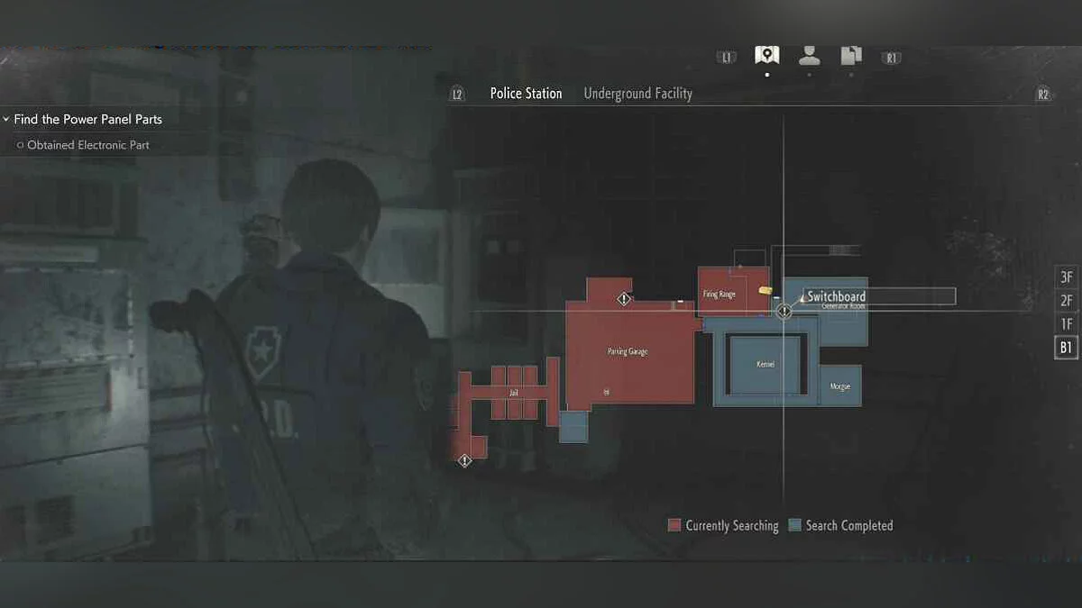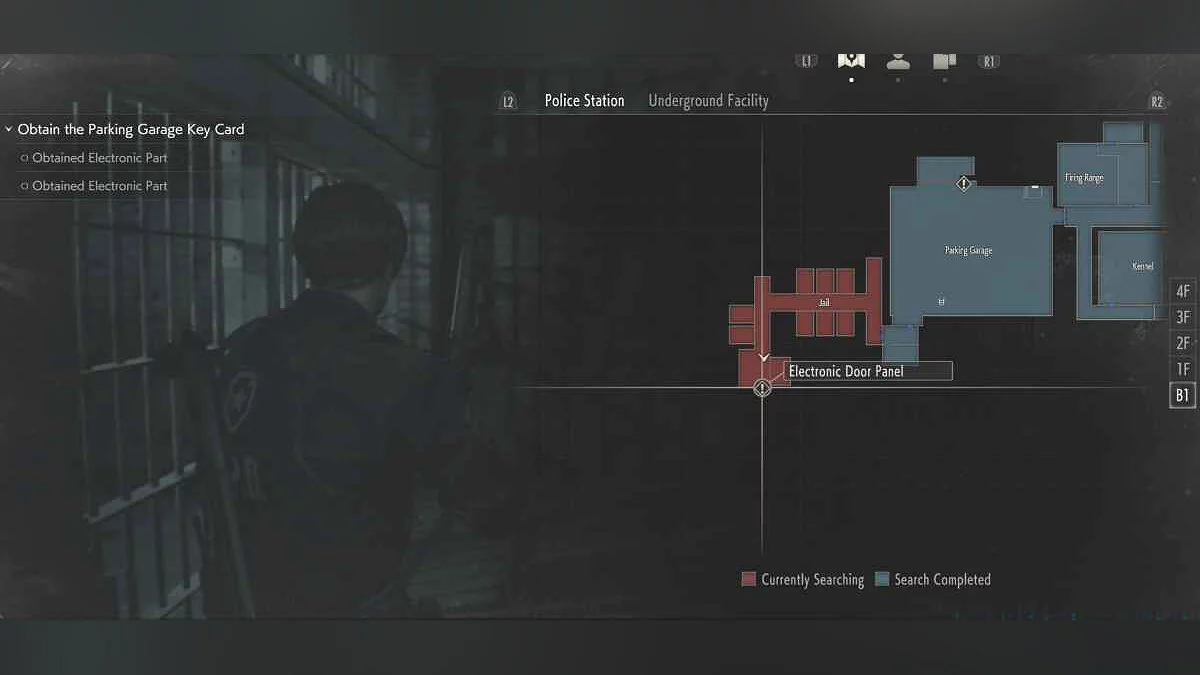 Теперь, в зависимости от того, играете ли вы за Леона или за Клэр, вы получите слегка различную загадку на дверной панели (Door Panel Puzzle) после того, как найдете две электронные части (Electronic Parts). Леон оказывается в тюрьме (Jail), которая недоступна для Клэр.