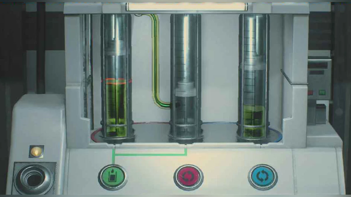 Использование вышеуказанных кодов разблокирует станцию синтеза препаратов (Drug Synthesis Station). Теперь вы можете положить туда картридж с раствором (Dispersal Cartridge) и начать синтез гербицидов (Herbicide Synthesis). На машине есть 3 цветные кнопки, следуйте приведенным ниже инструкциям из исходного положения. Если вы уже пробовали решить головоломку самостоятельно, то решение не сработает, поскольку ваши положения пробирок будут отличаться от значений по умолчанию. Если вы еще не нажали какие-либо кнопки, то вы сможете скопировать приведенное ниже решение. Цель состоит в том, чтобы заполнить один картридж до красного кольца. Каждый из 3 картриджей имеет разные максимальные уровни заполнения. Вы можете заметить, что каждый картридж имеет разную высоту. Только средний и большой может вместить достаточно жидкости, чтобы достичь красной отметки. Вы должны переместить зеленую жидкость между пробирками, чтобы получить разные объемы заполнения.