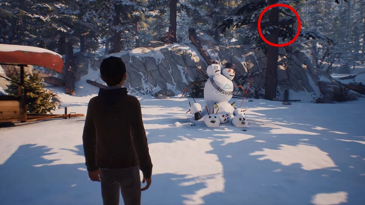 Первый сувенир можно найти в самом начале эпизода. Когда Шон и Дэниэль подойдут к заброшенному дому возле реки. Пройдите мимо двуглавого снеговика и подойдите к огромному дереву. На нем будет металлическая коробка. Нажмите на кнопку «Посмотреть», а затем активируйте взаимодействие с Даниэлем (фраза выделена синим цветом). Он поможет вам достать сувенир и получить его.