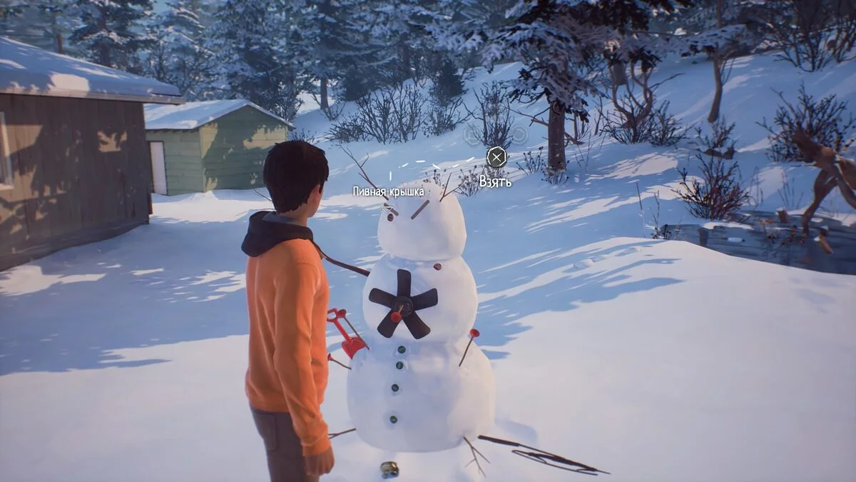 Третий сувенир можно получить, когда Шон будет искать своего младшего брата в доме Криса. Не заходите в дом, а обойдите его и взгляните на задний двор. Там вас будет ждать снеговик. Взаимодействуя с ним, вы увидите пивную крышку, которая играет роль глаза снеговика. На ней появится кнопка «Взять». Это ваш третий сувенир.