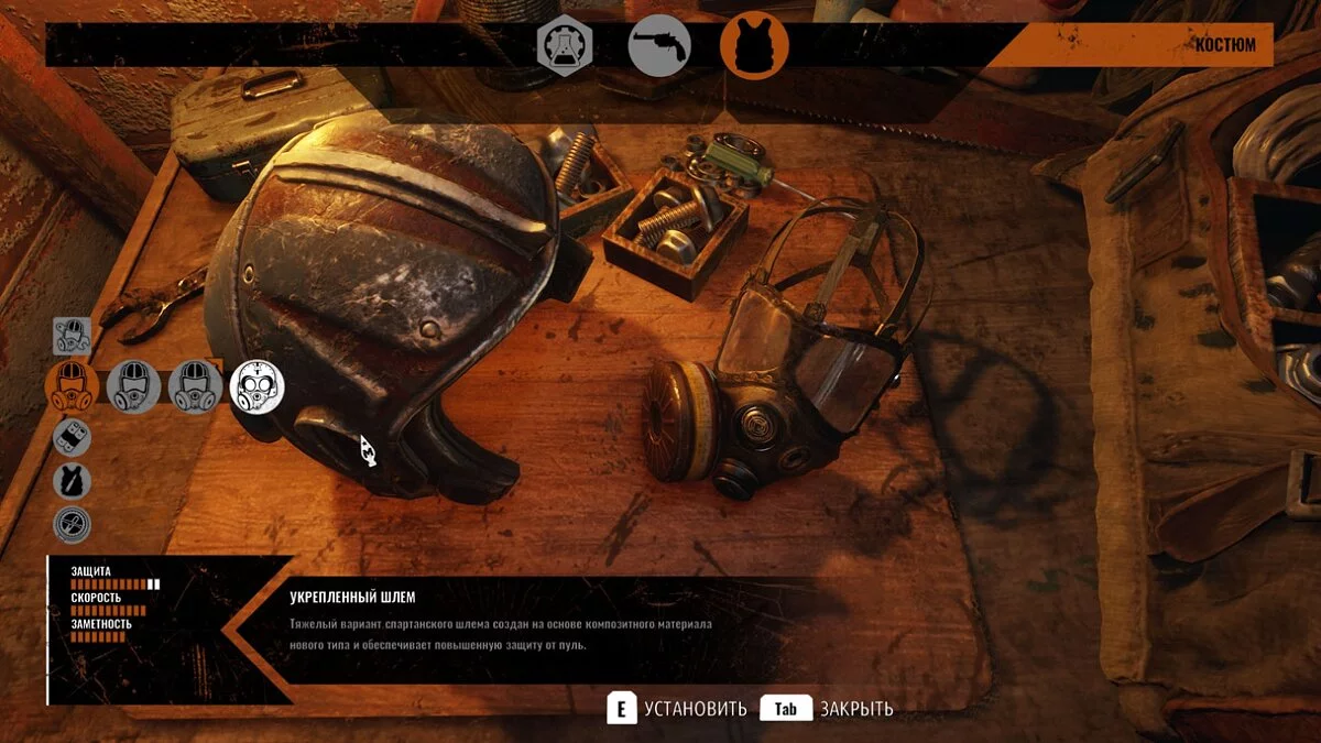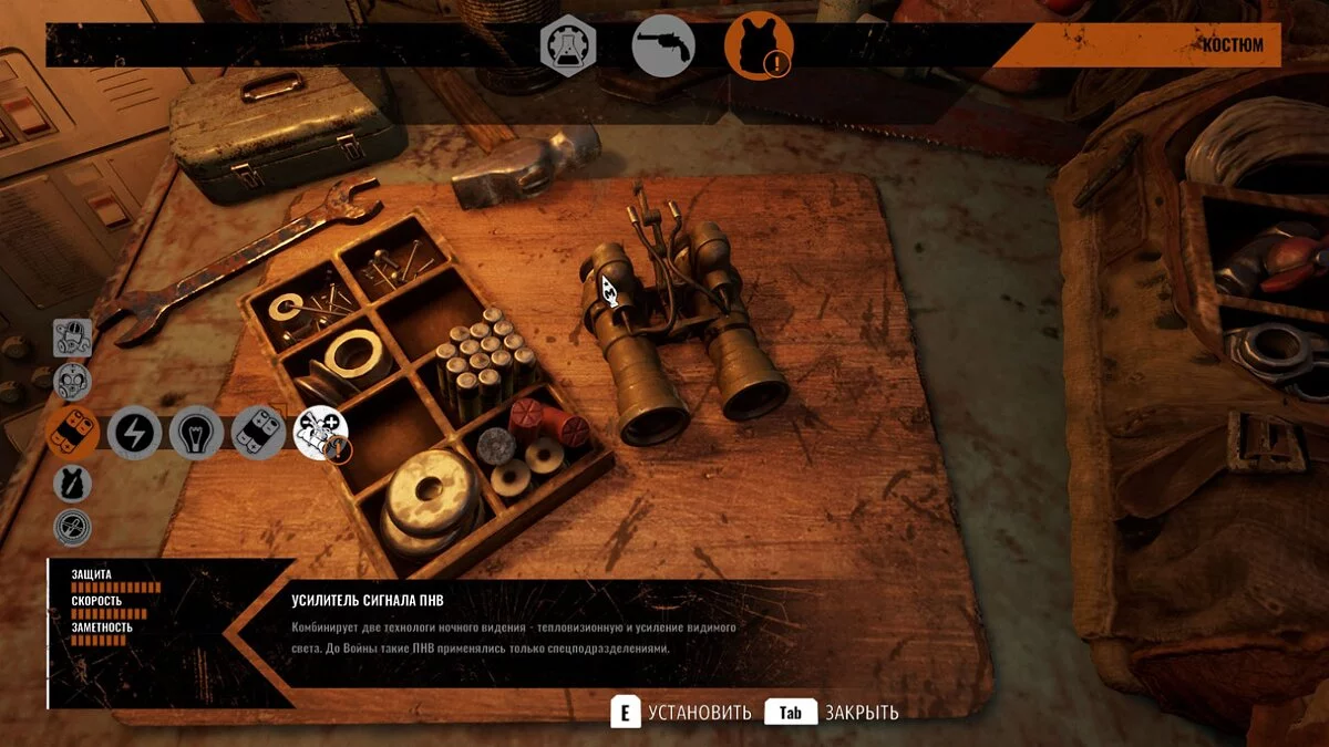 Вы можете улучшать свое снаряжение — бронежилет, противогаз, шлем и т. д. — на рабочем месте. На это не тратятся ресурсы, но сначала вам нужно найти конкретные детали для улучшения в мире игры.