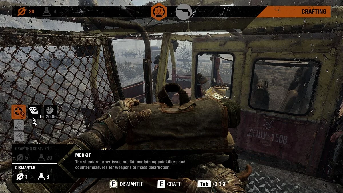 Среди них есть аптечки, фильтры для противогаза, метательные ножи и даже боеприпасы к некоторым видам оружия. Просто зажмите кнопку «I» в PC-версии игры (L1, если вы играете на PlayStation 4), чтобы сделать привал и заняться крафтом. Это не раз выручит вас в трудную минуту.