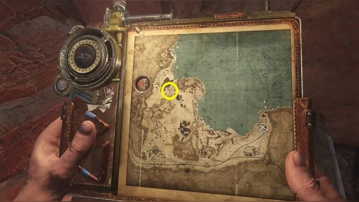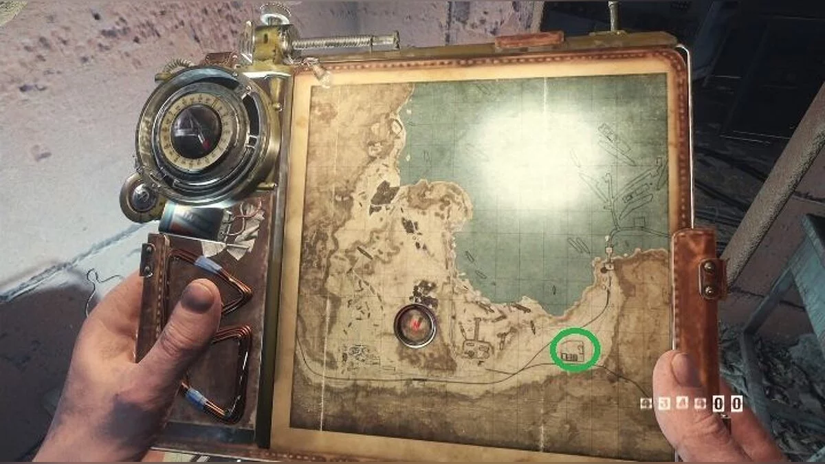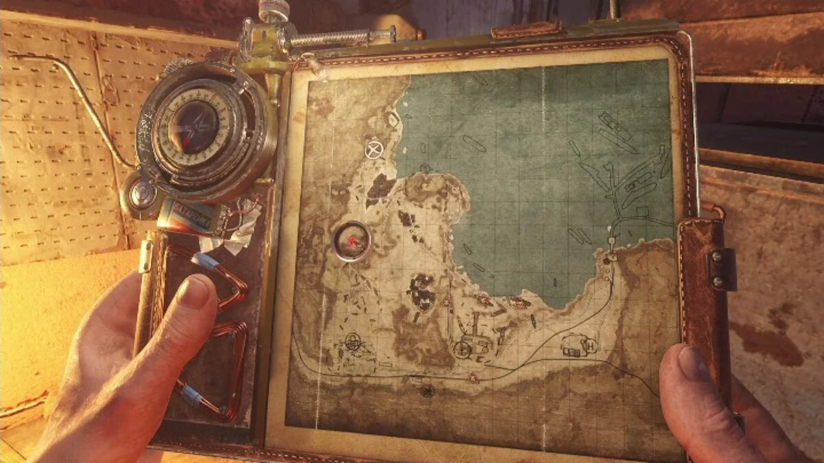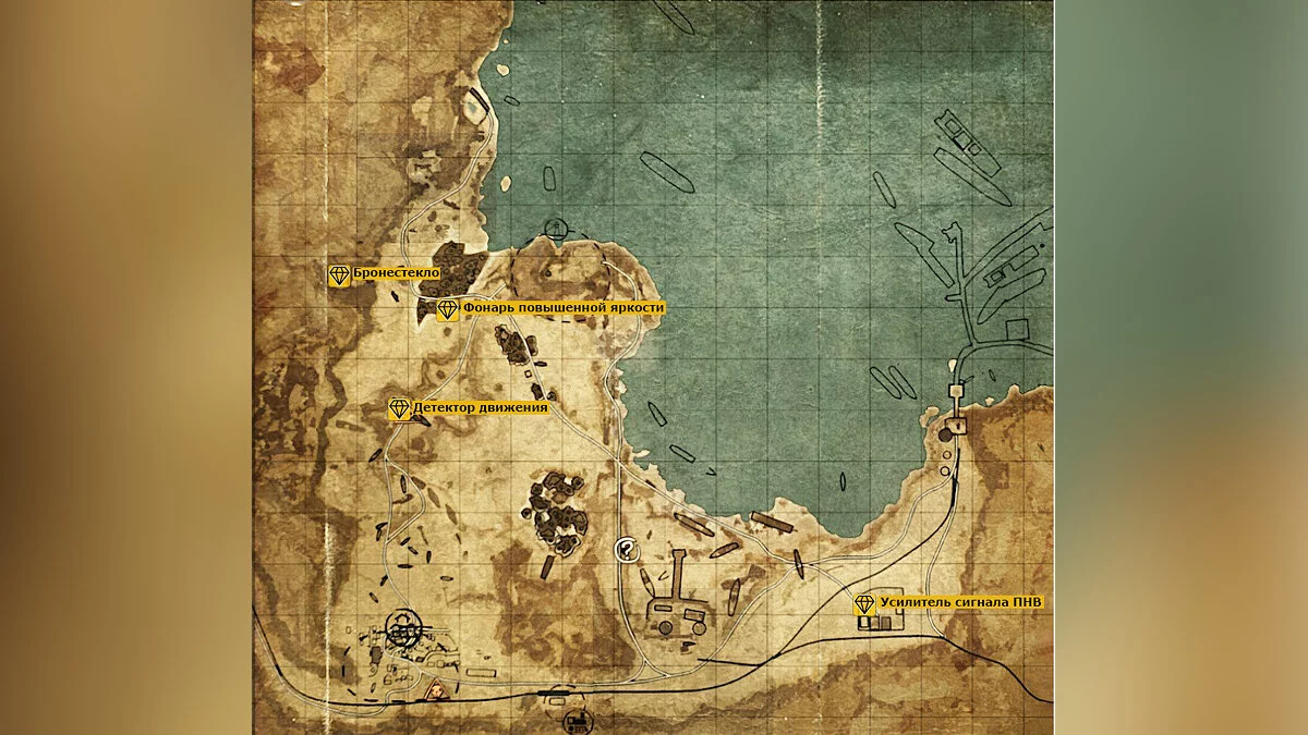Желтым цветом на карте отмечены улучшения, а зеленым — интересные места (появятся позже). Некоторые из них содержат ресурсы для крафта, другие боеприпасы, третьи скрытые заметки и открытки. Карта показывает скрытые модификации оборудования и оружия, а также некоторые из наиболее интересных мест на Каспии.