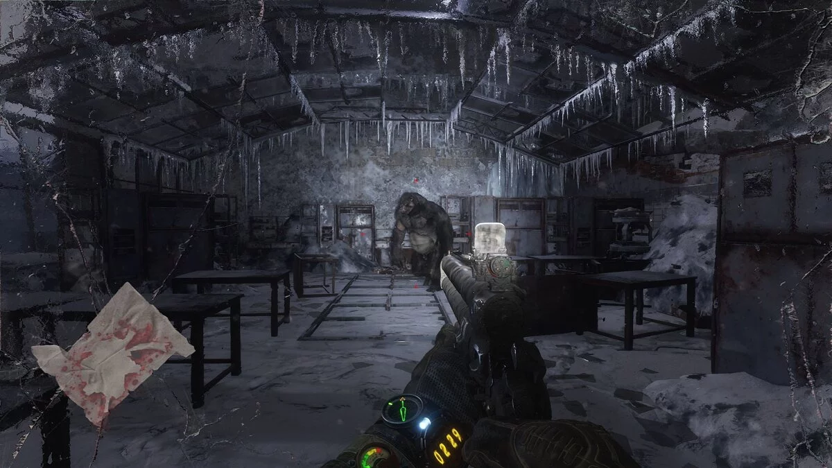 Но как лучше двигаться? Если вы играете на консоли, то лучше всегда слегка сдвигать стик, отвечающий за движение. Тогда Артем будет не бегать, а ходить. На ПК такой опции нет, поэтому придется перемещаться вприсядку. Тем не менее, если с патронами для дробовика проблем нет, то проще просто выпустить весь барабан в гориллу и идти дальше.