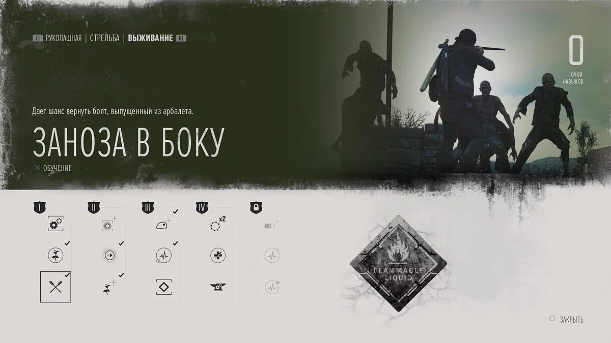 Заноза в боку (выживание) — шанс вернуть стрелу, выпущенную во врага из арбалета. Часто стрел вам будет не хватать, а поэтому вернуть ее из тела противника очень выгодно.