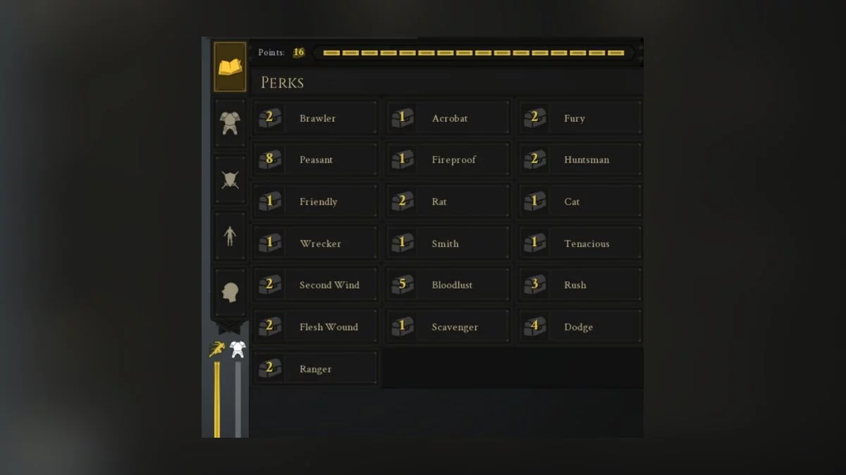 Крестьянин (Peasant): ограничивает вооружение, броню и меняет ее на крестьянское снаряжение: мотыги, сковороды и тому подобное. Стоимость: 8 очков. Самый дорогой и по совместительству самый интригующий и бесполезный перк в игре. Бегать по полю боя в рубахе и забивать мотыгой рыцарей это, конечно, весело первые пару раз. Но если вы хотите сражаться серьёзно, то восьми очкам следует найти гораздо более полезное применение.