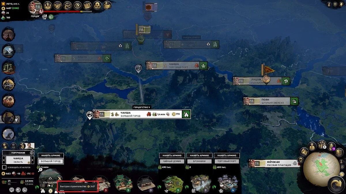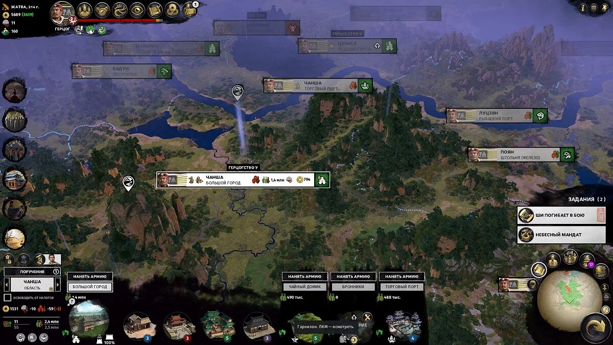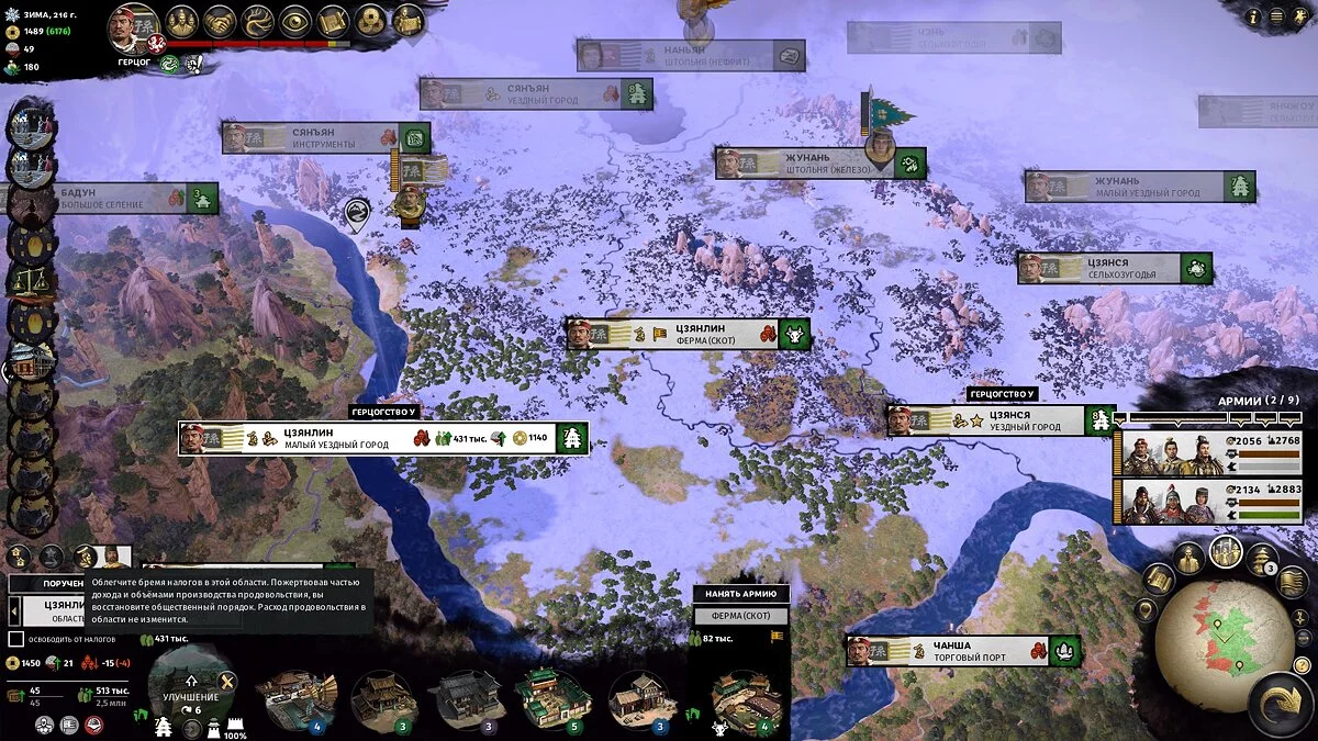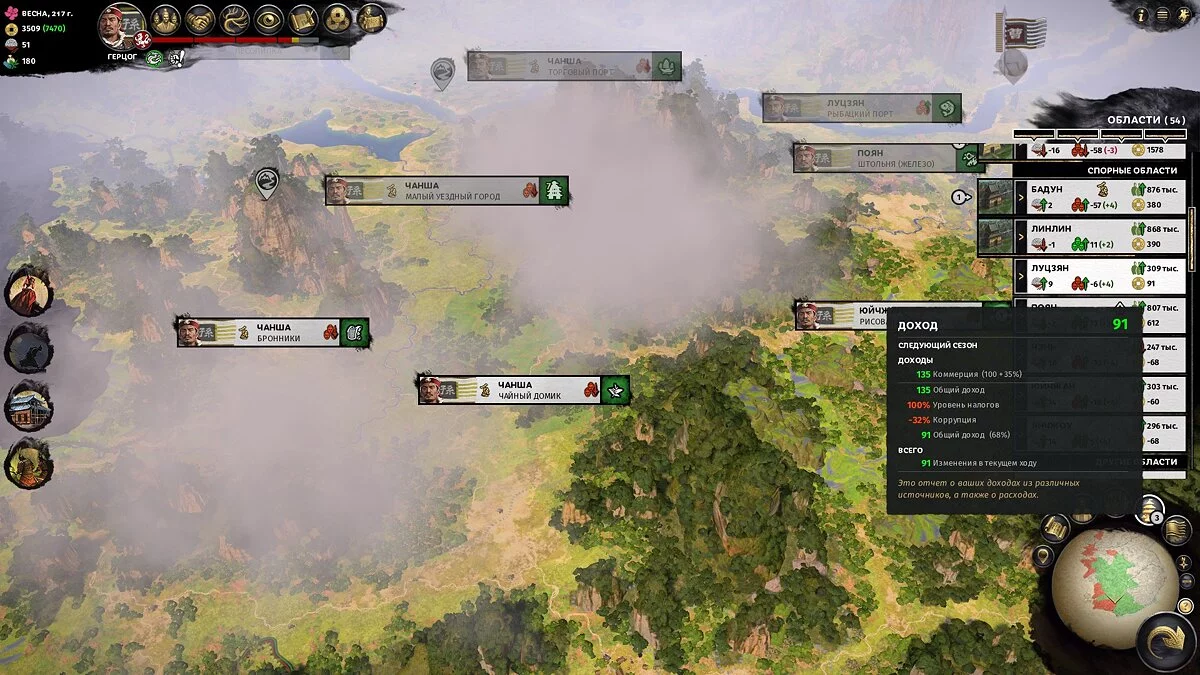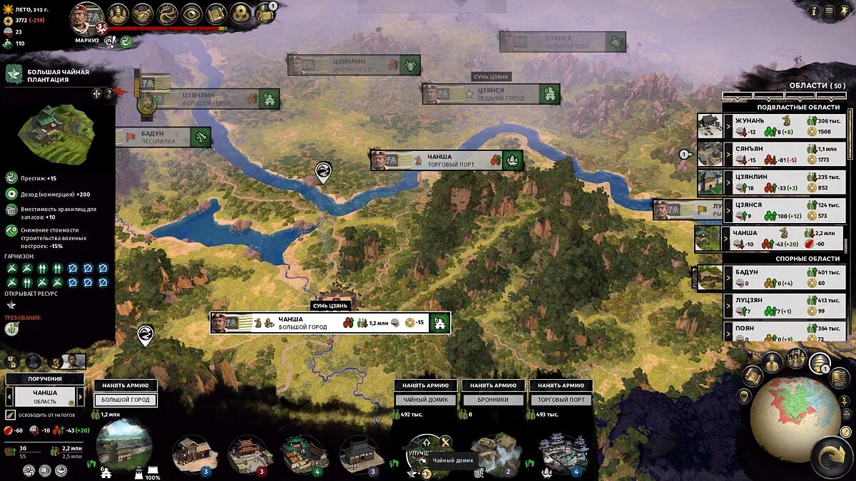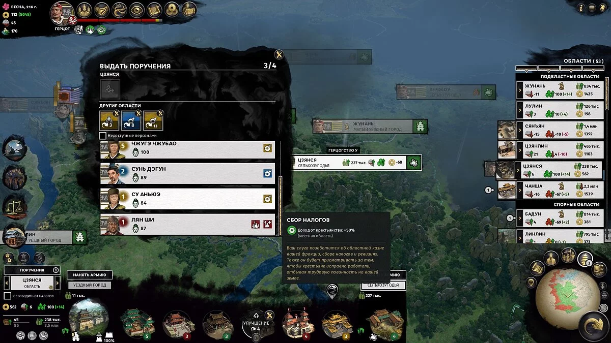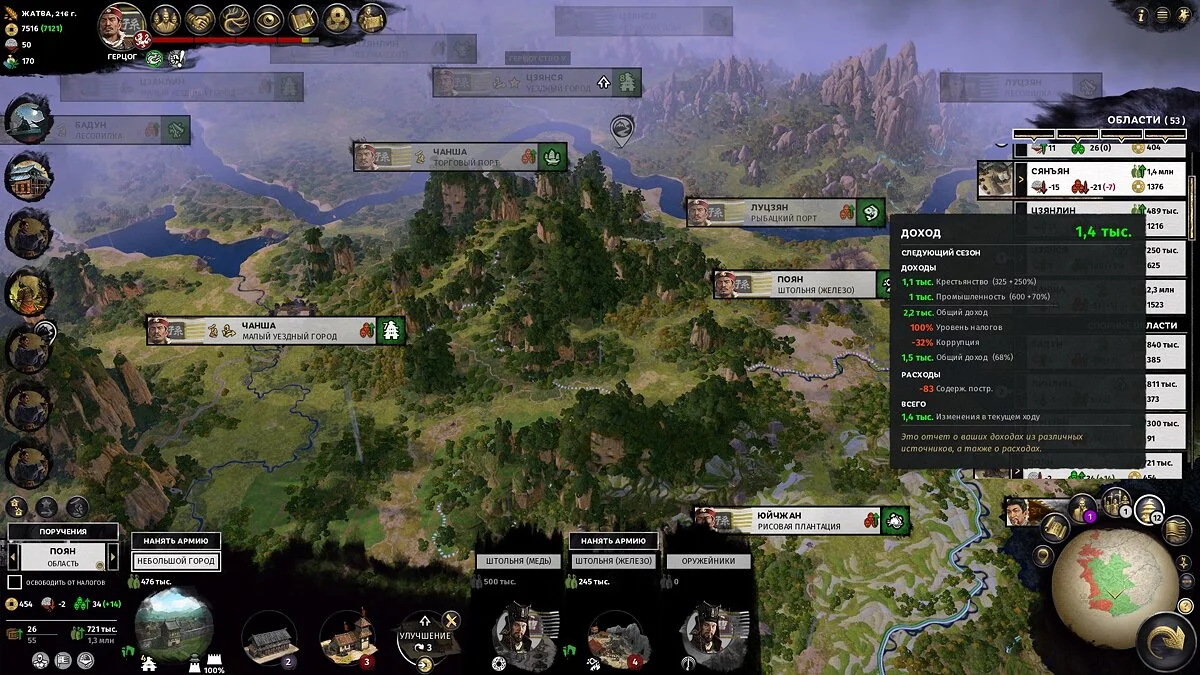 Не рассчитывайте на большие доходы первые 30-50 ходов — территории не будут достаточно развиты, а крестьян будет слишком мало для нормальных налогов. На этом этапе ресурсные уезды (шахты, пастбища, специи и другое) могут давать приличный доход, так что есть смысл захватывать их в первую очередь.