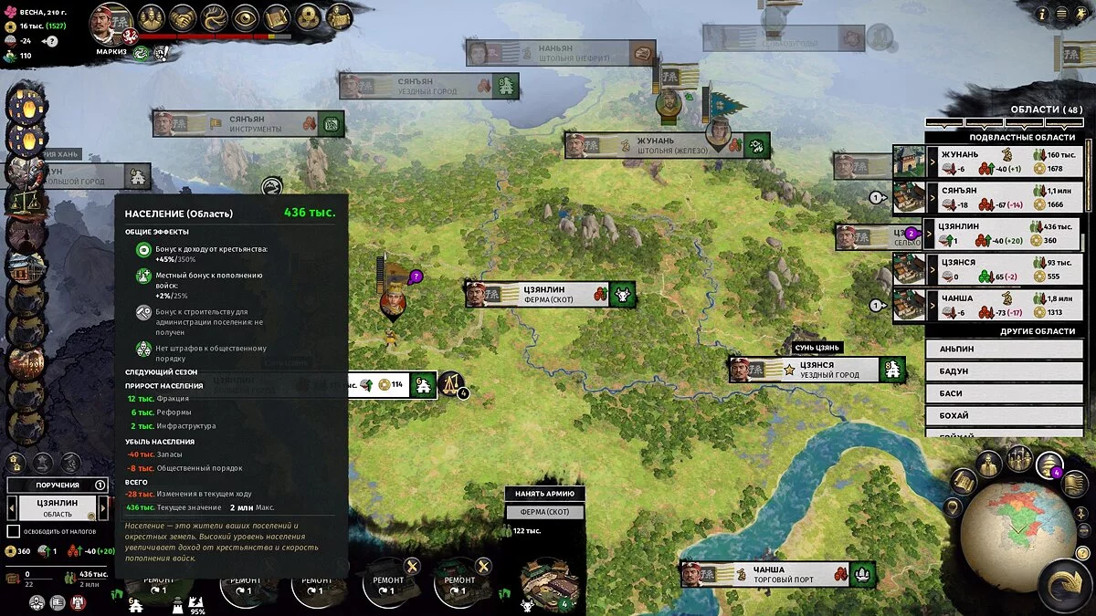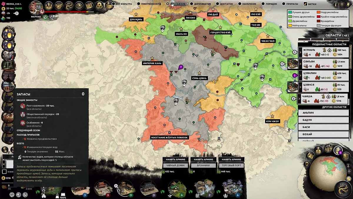 Одним из геймплейных нововведений Three Kingdoms стало население. Это фундамент, обеспечивающий феодала солдатами, налогами и формирующий экономику, так что чем его больше, тем лучше. Чтобы вы представляли масштаб, максимальный размер жителей в обычной области — 7 000 000 человек.