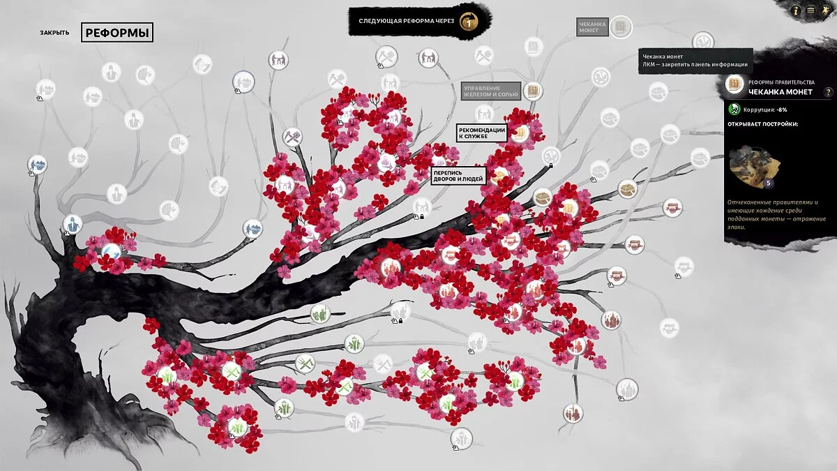 Важно проводить и реформы, причем на древе развития под них выделено сразу три ветви — серая, желтая и зеленая, соответственно, промышленность, коммерция и сельское хозяйство.