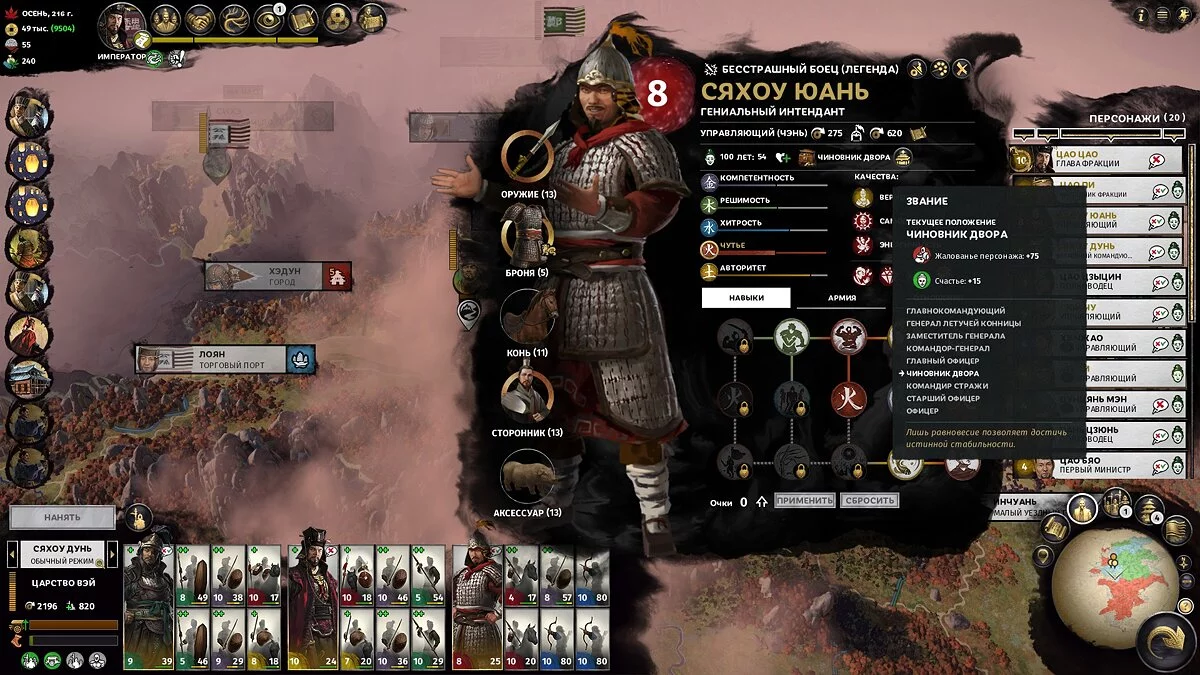 Все персонажи могут возглавить армию или получить ту или иную должность при дворе, либо даже совместить, но нужно выбирать внимательно, исходя из их талантов и амбиций.