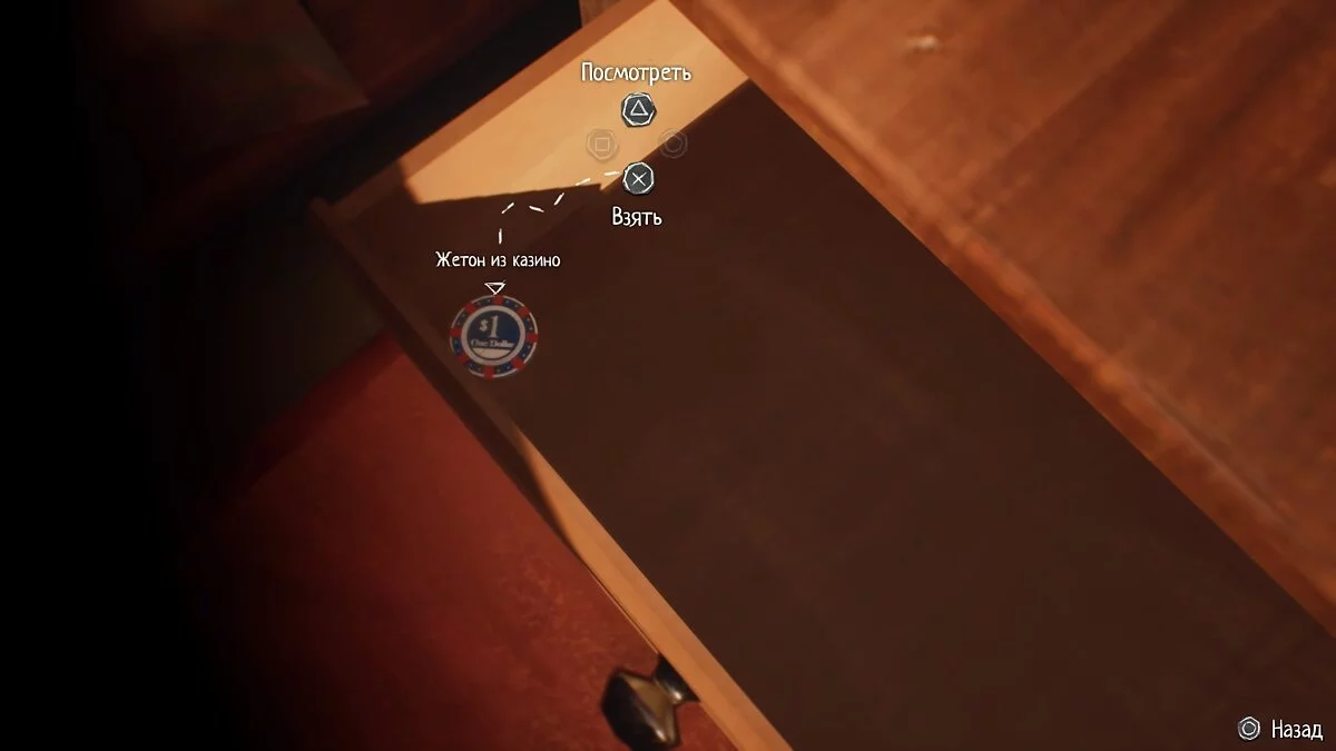 Выйдя из душа, откройте ящик между кроватями. Подберите жетон казино. Его можно не сразу заметить, так как он лежит в темном углу.