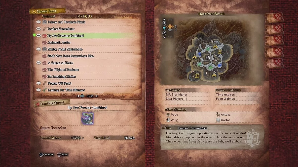 После того, как ваш Палико (Palico) встретится с некоторыми местными кошками (проверьте их местоположение на карте), вы получите новый квест в разделе «Важные заказы» в Ресурсном центре (Resource Center), который называется Культурный обмен: Морозный простор (Cultural Exchange: Hoarfrost Reach). Тут-то и придёт время, когда вы будете доказывать свою силу Боабоа (Boaboa).