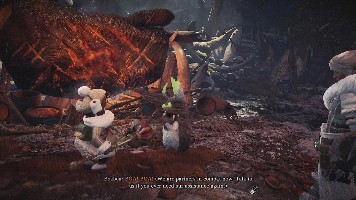 На протяжении всей охоты эти мохнатые существа будут атаковать монстра, используя различные устройства и ловушки. Вам же остается лишь добить его предпочитаемым вами оружием. После того, как зверь падёт, Боабоа (Boaboa) поблагодарят вас за оказанную помощь.
