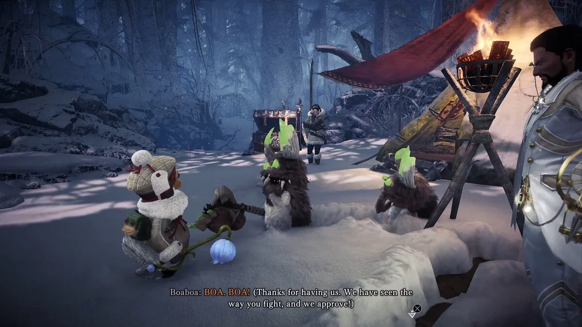 Помимо этого, дружба с Боабоа (Boaboa) сопровождается и обычными наградами в Морозном просторе (Hoarfrost Reach), например котами, стоящими на уступах и ждущими шанса помочь вам в поимке монстров, а также возможность подружиться с некоторой местной дикой живностью.