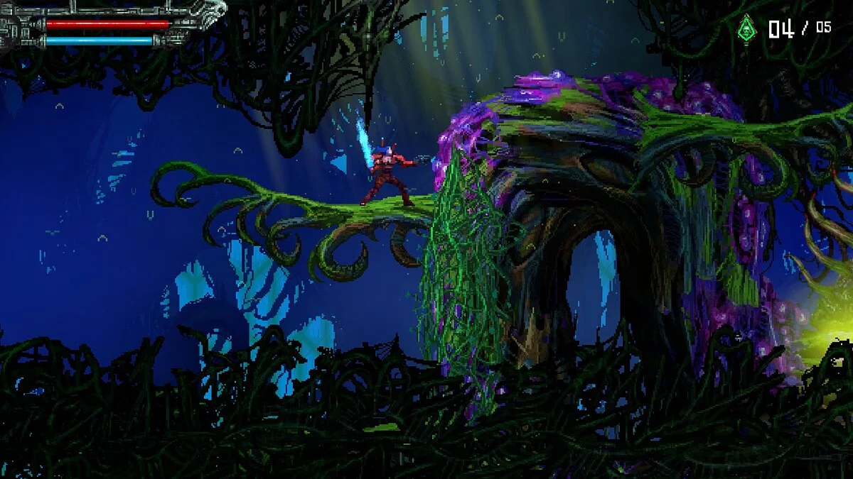 Сразу после чекпоинта и до того, как вы получите волчий свет (Wolflight), ударьте щупальце в стволе дерева и дайте ему забросить вас в ветку выше. Идите направо и позвольте следующему щупальцу запустить вас через пропасть. Вы найдете Идола Возрождения (Resurrection Idol) и Кровавый Металл, а также двух летающих монстров, которые появляются, когда вы пересекаете ветку.