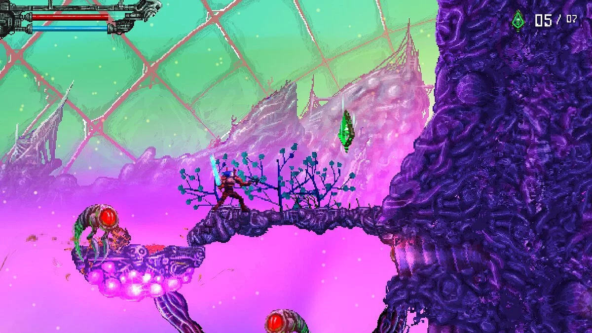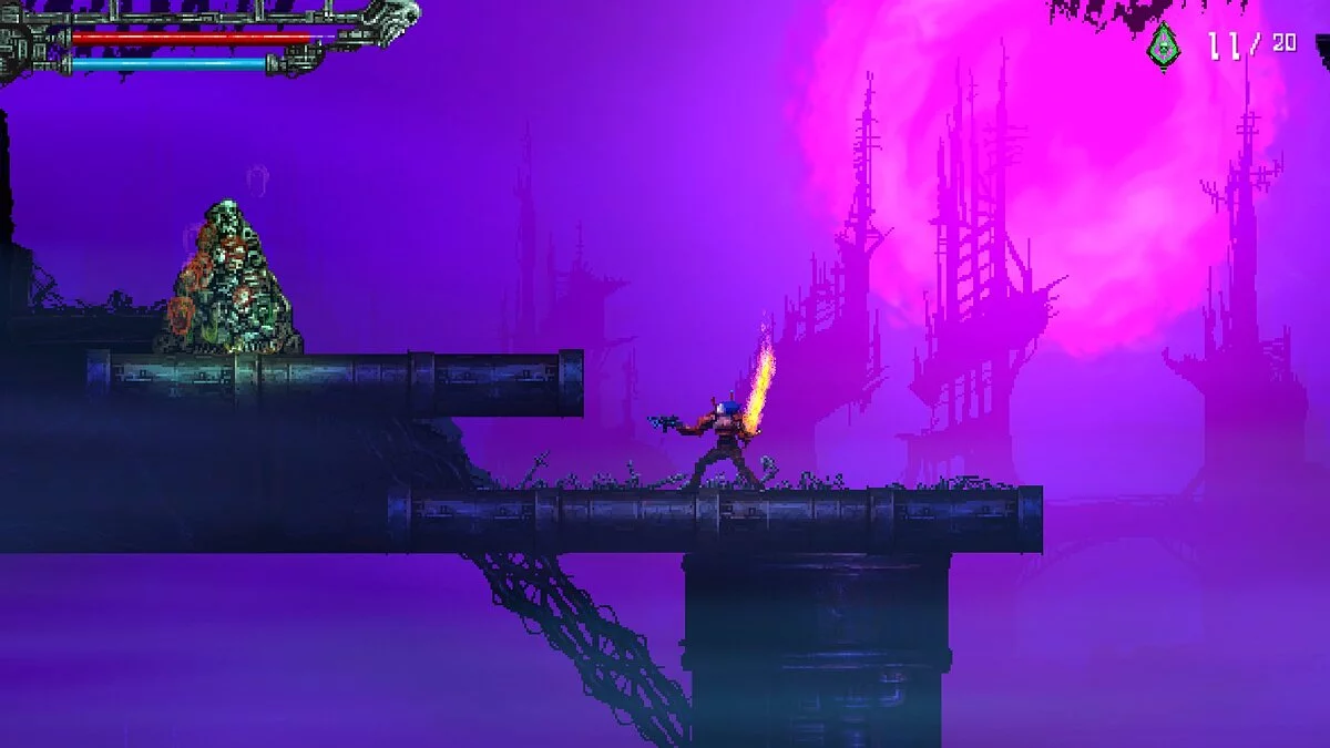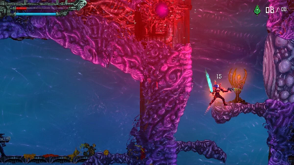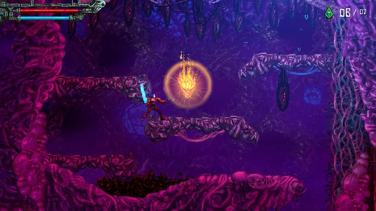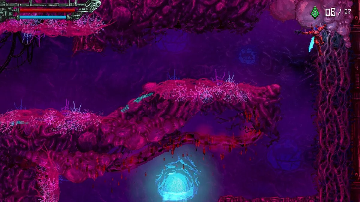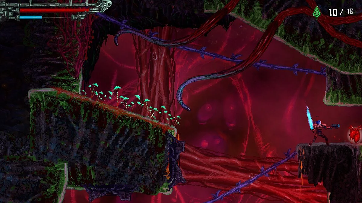 Спрыгните через платформу перед кораблем (powerless ship). Куча является приманкой и содержит большое сердце (big heart). Как только вы подпрыгиваете к нему, появляется ракетный монстр, который сбрасывает Кровавый Металл.