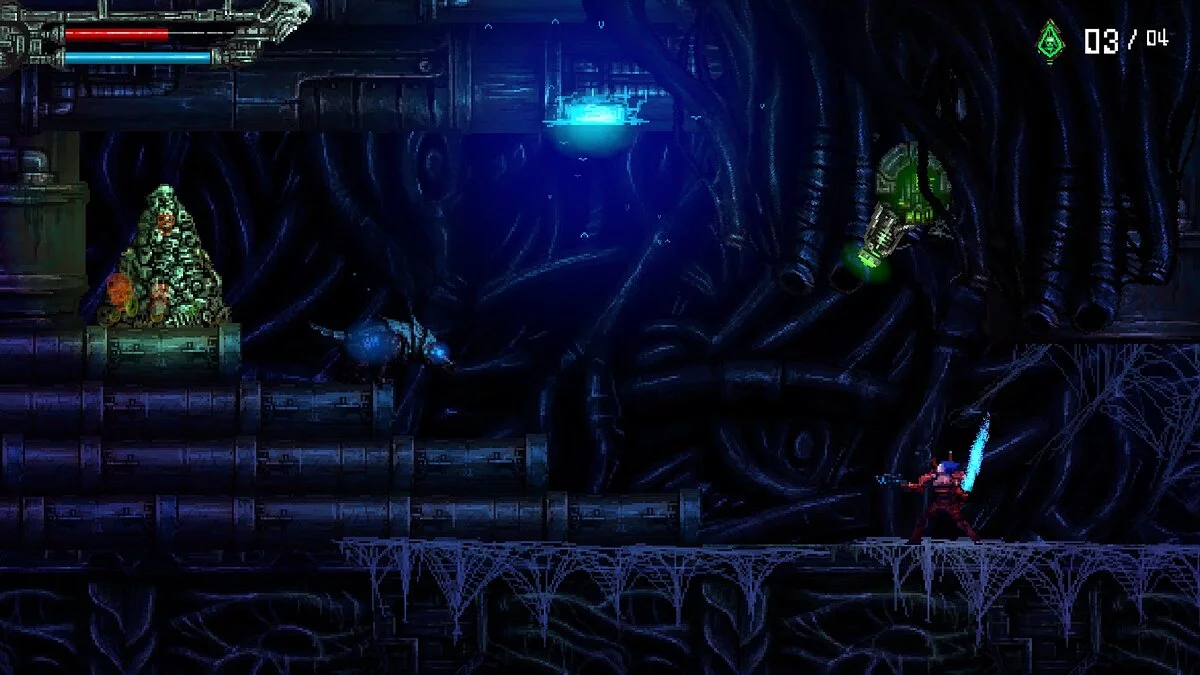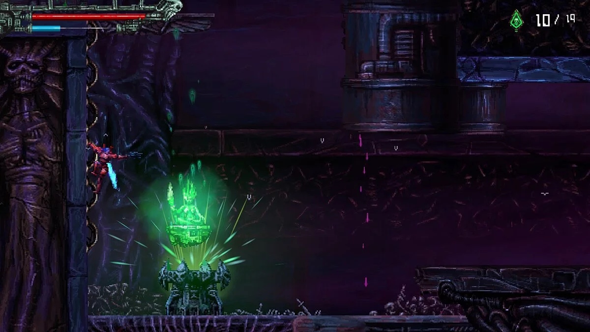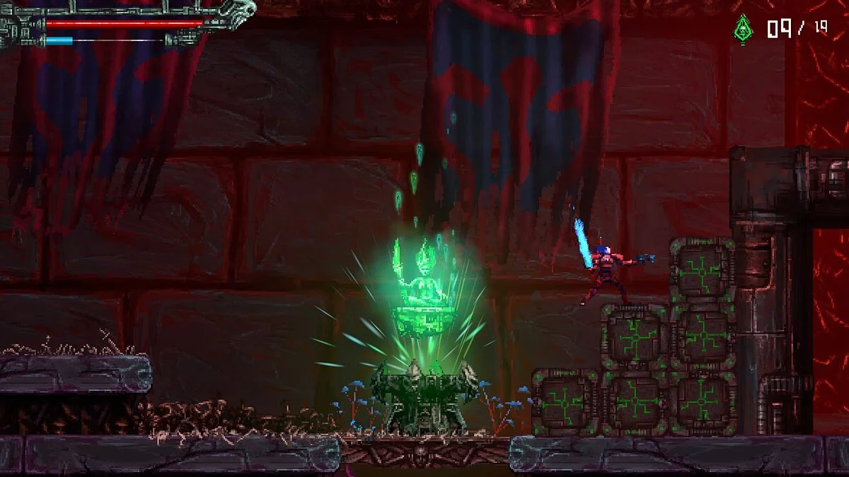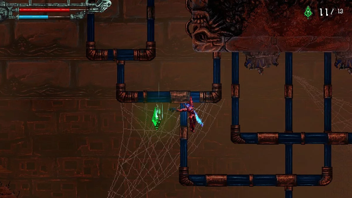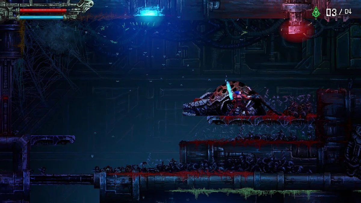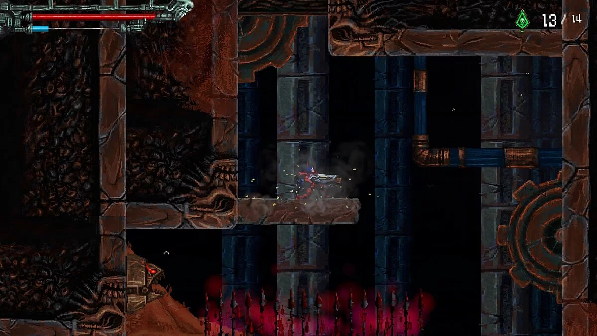 На этом чекпоинте поднимитесь по лестнице на стену и разбейте блоки. Поднимитесь на воздушной струе вверх и прыгайте через комнату, игнорируя дронов. Здесь можно получить Кровавый металл и Идола Возрождения.