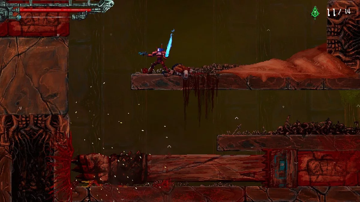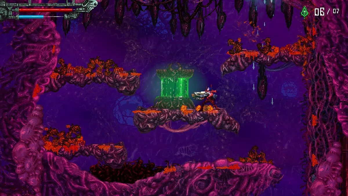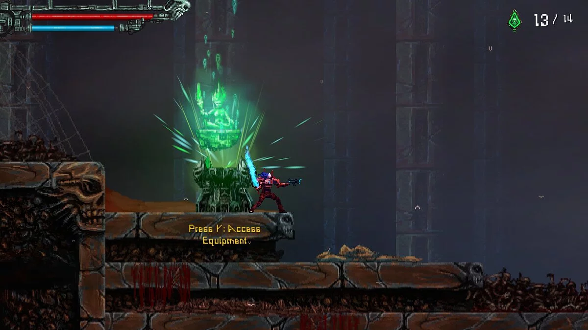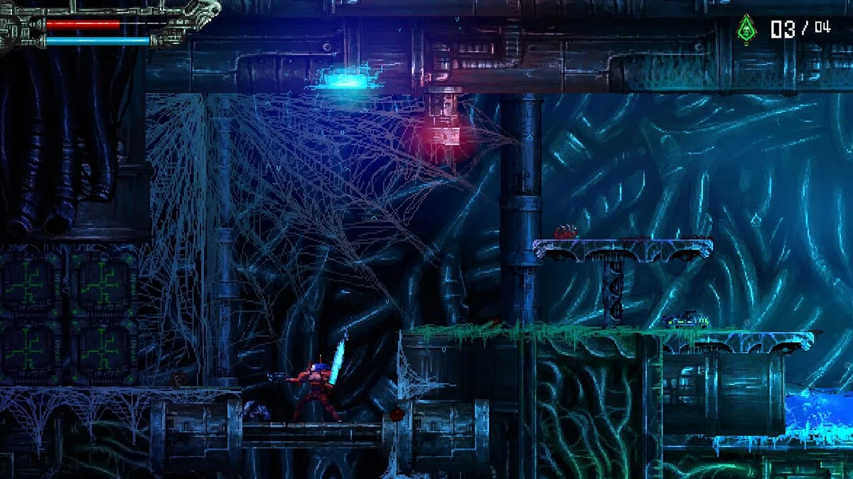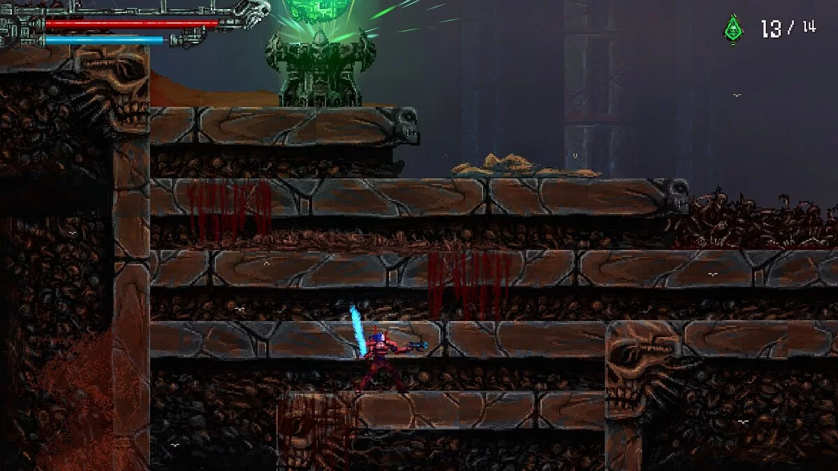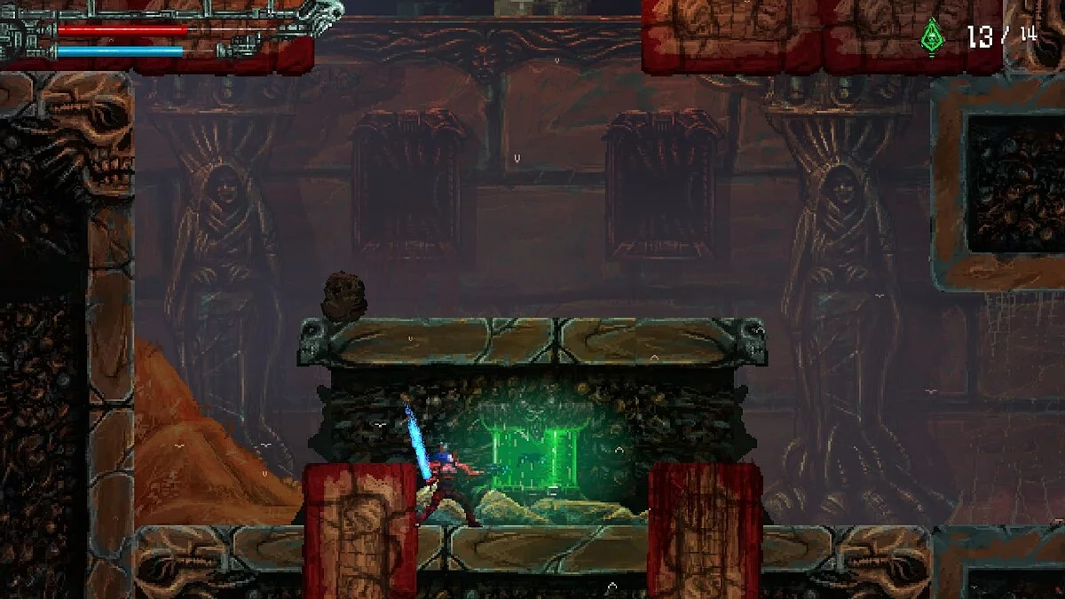 На этом чекпоинте поднимитесь по лестнице на стену и разбейте блоки. Поднимитесь на воздушной струе вверх и прыгайте через комнату, игнорируя дронов. Здесь можно получить Кровавый металл и Идола Возрождения.