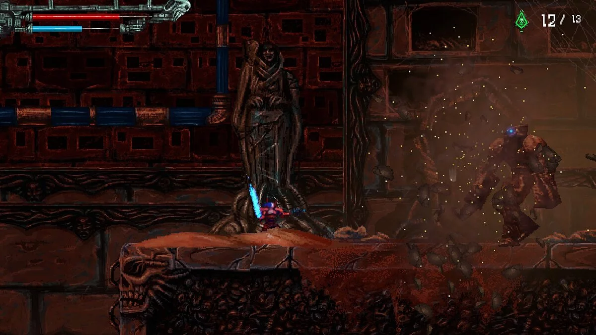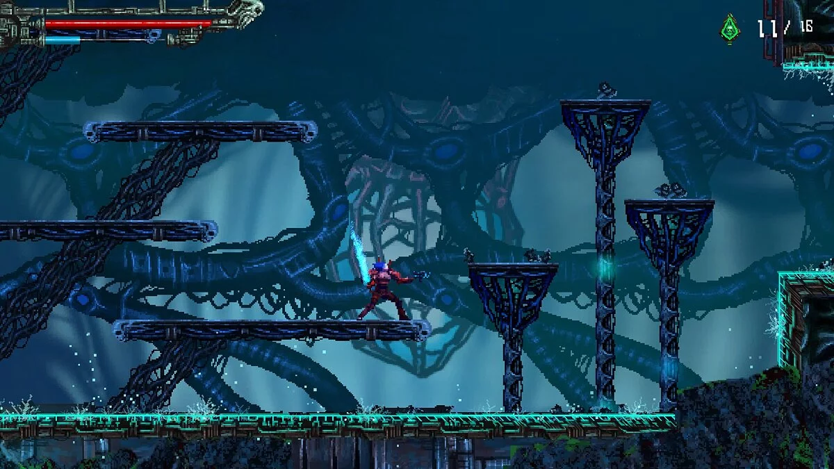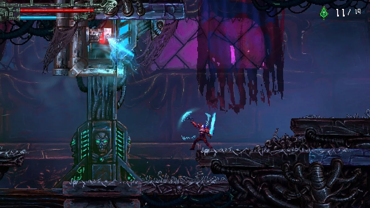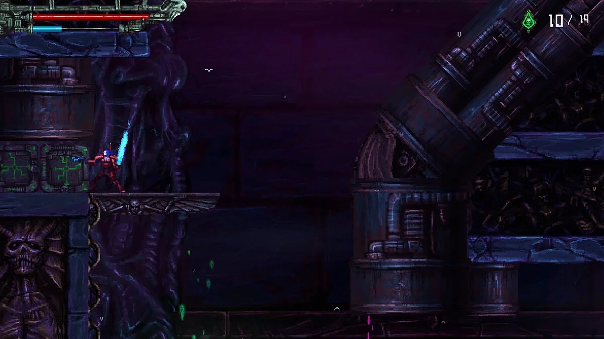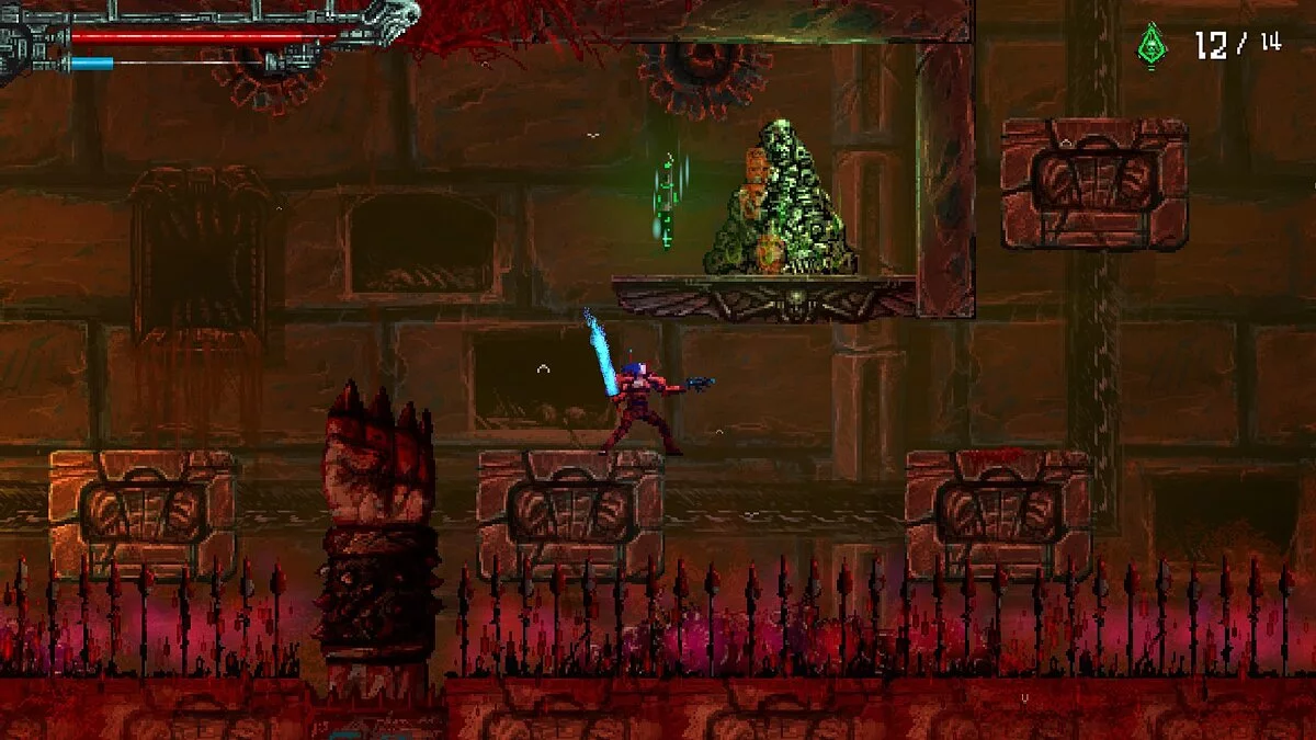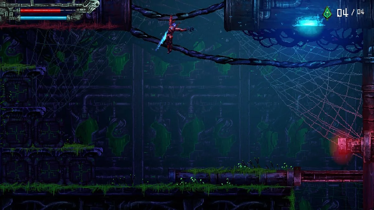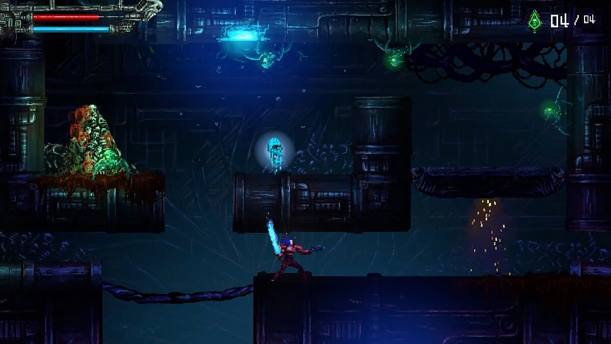 На этом чекпоинте поднимитесь по лестнице на стену и разбейте блоки. Поднимитесь на воздушной струе вверх и прыгайте через комнату, игнорируя дронов. Здесь можно получить Кровавый металл и Идола Возрождения.