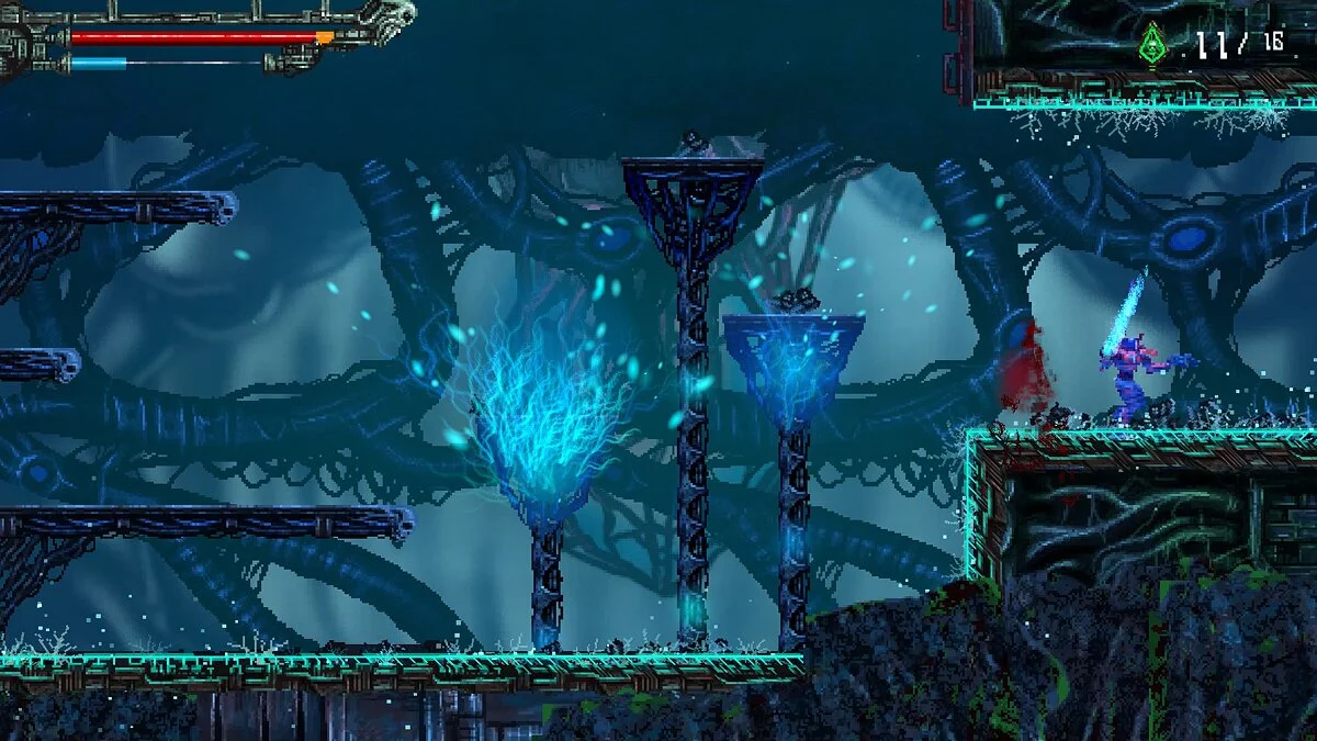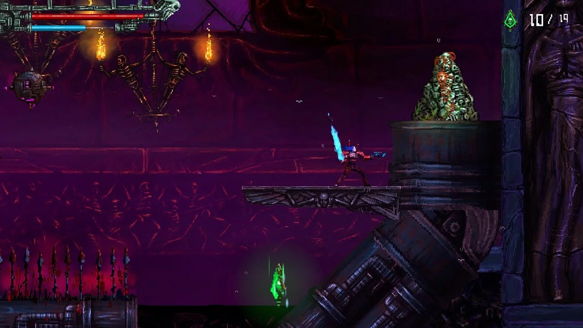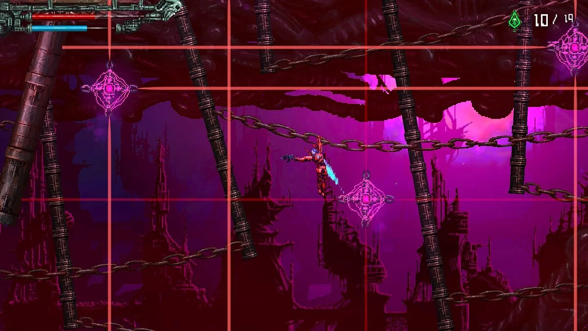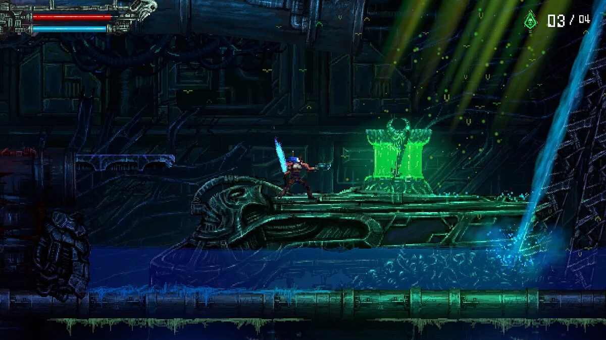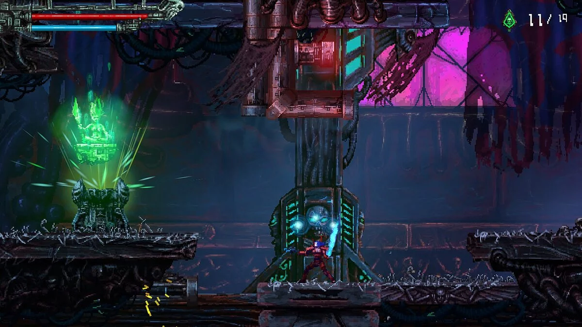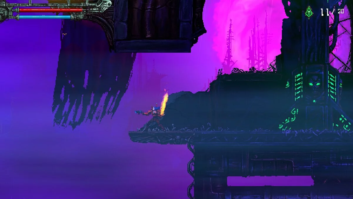 На этом чекпоинте поднимитесь по лестнице на стену и разбейте блоки. Поднимитесь на воздушной струе вверх и прыгайте через комнату, игнорируя дронов. Здесь можно получить Кровавый металл и Идола Возрождения.