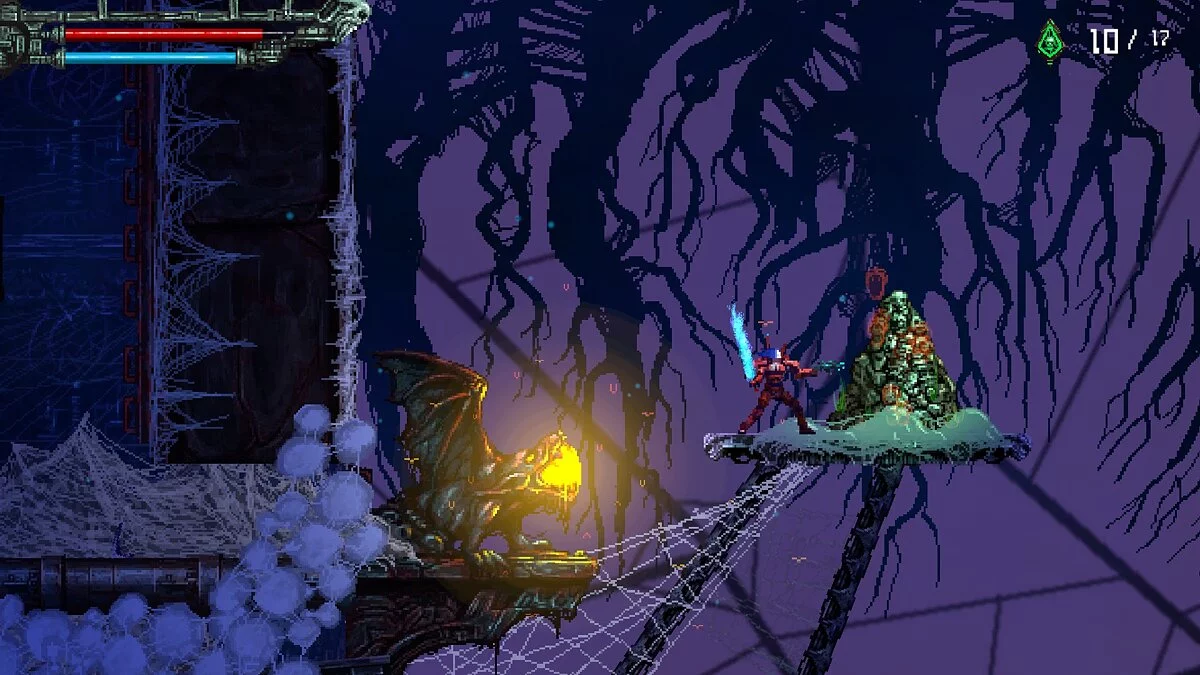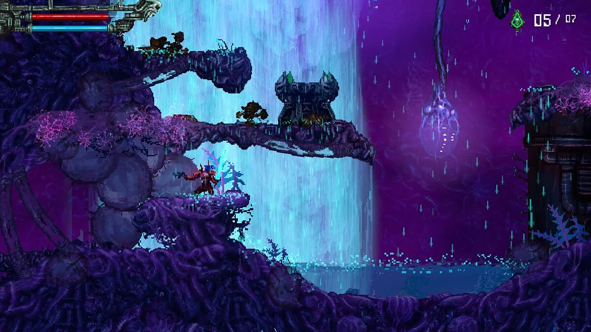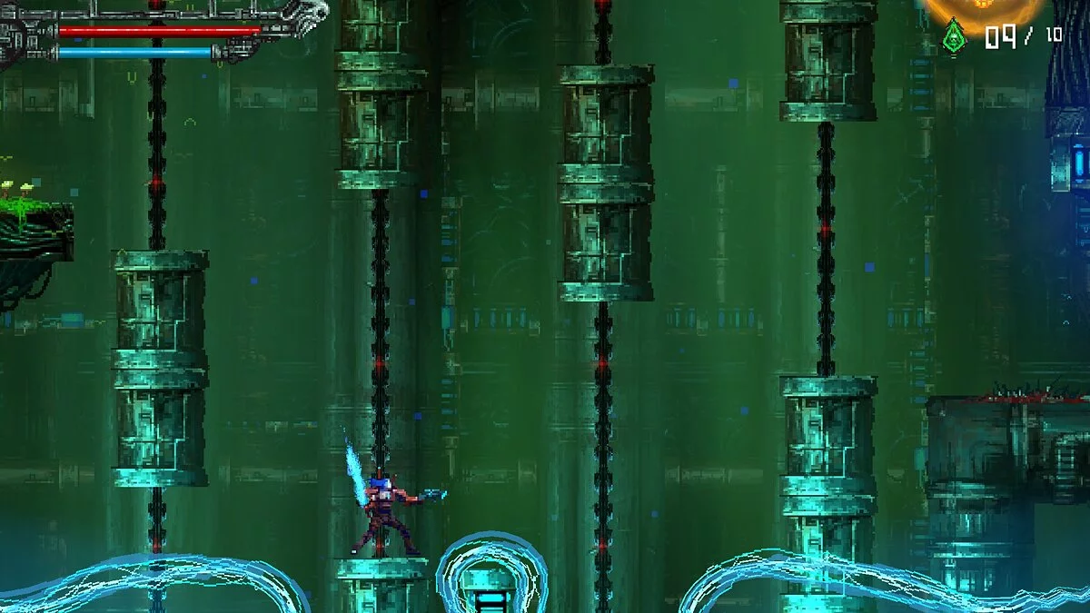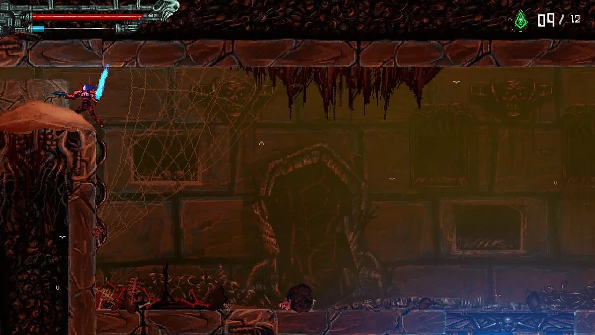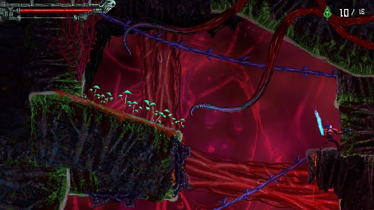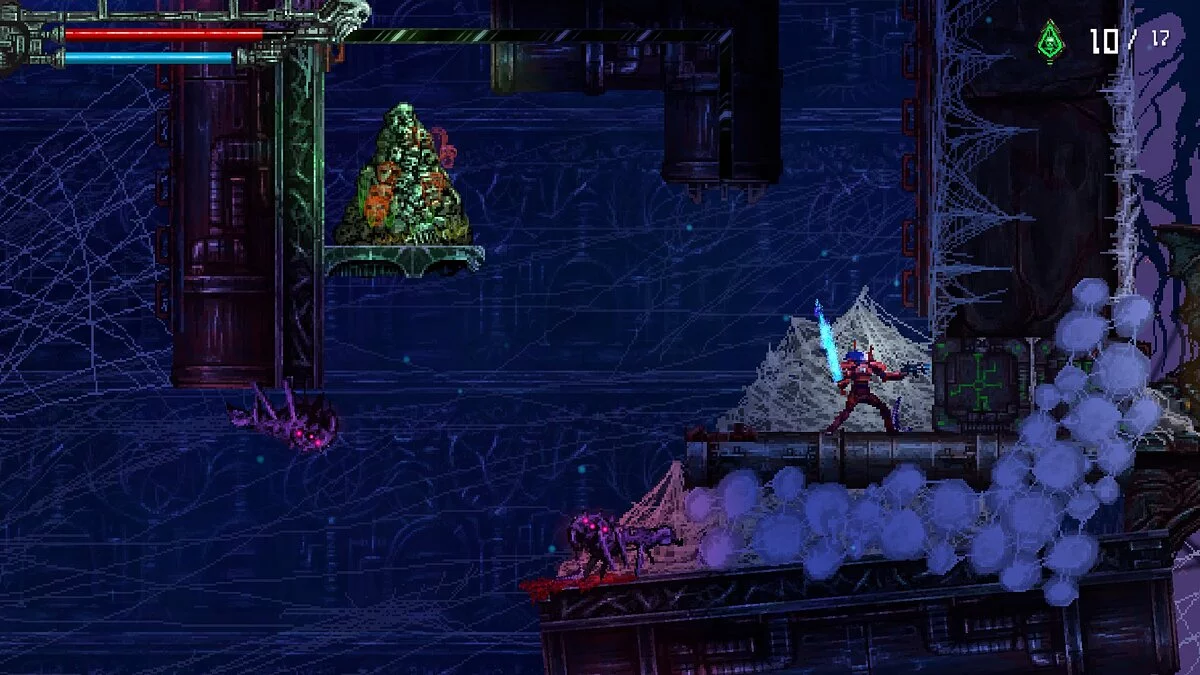 На этом чекпоинте поднимитесь по лестнице на стену и разбейте блоки. Поднимитесь на воздушной струе вверх и прыгайте через комнату, игнорируя дронов. Здесь можно получить Кровавый металл и Идола Возрождения.