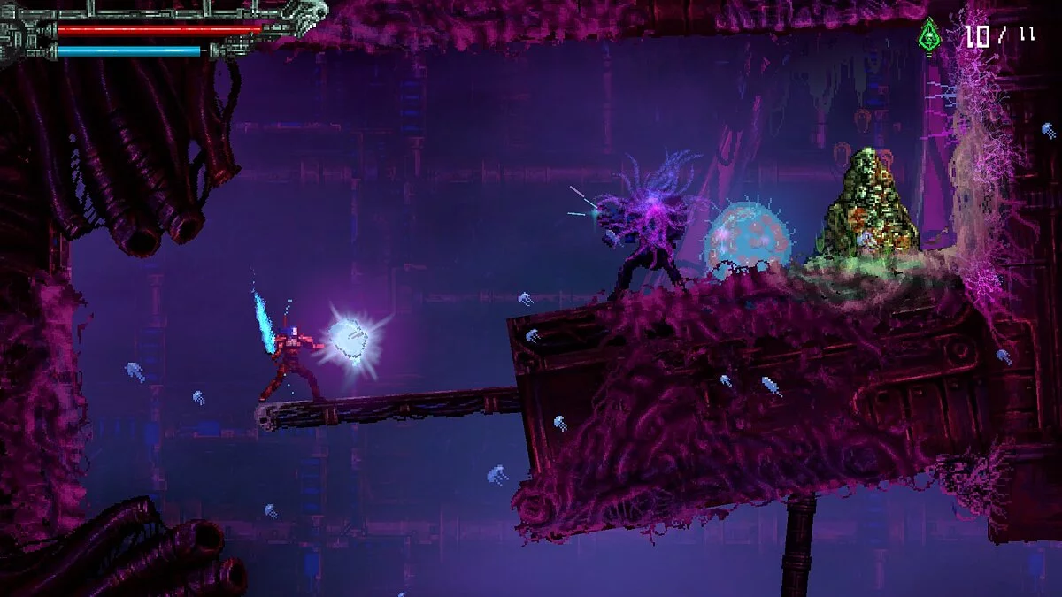 Прямо перед Червем Миазма (Miasma Worm) прыгайте на кабель, уничтожайте щупальца и продвигайтесь влево. Очистите больше щупалец и убейте зараженного солдата за Кровавый Металл.