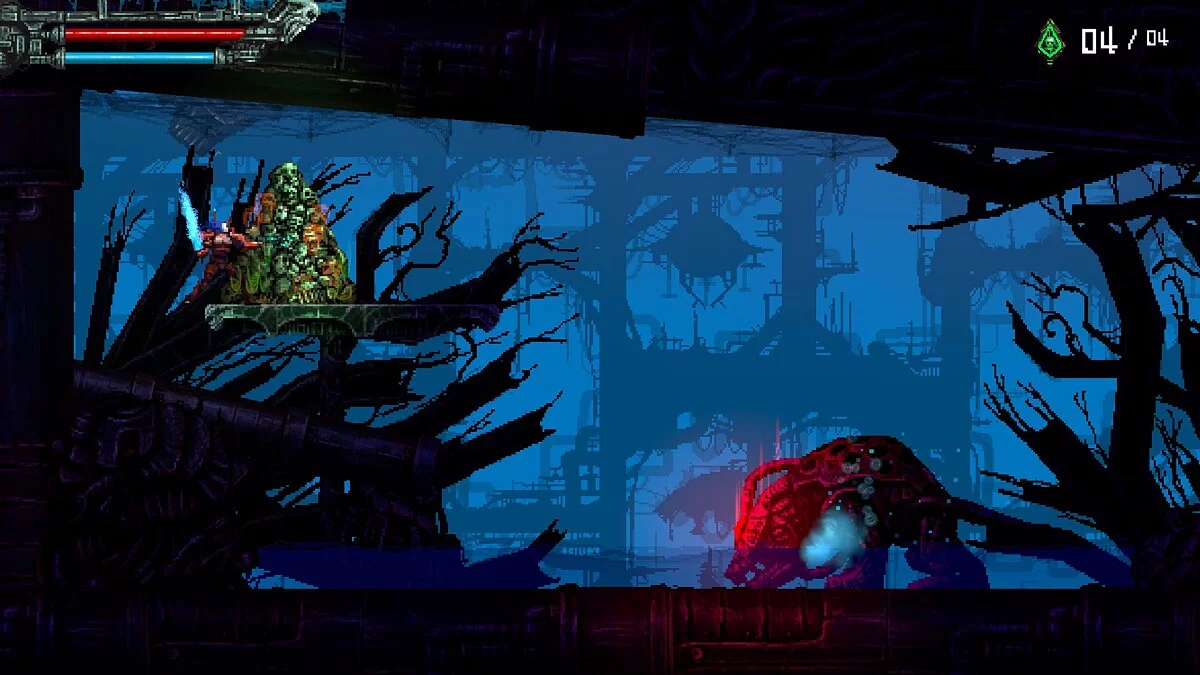 Уничтожьте большой каменный блок. Пройдите дальше и прокатитесь на движущихся платформах, чтобы найти Кровавый Металл и Идола Возрождения.