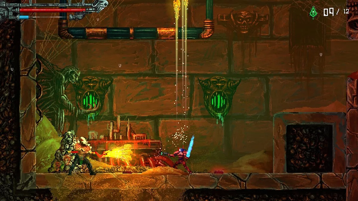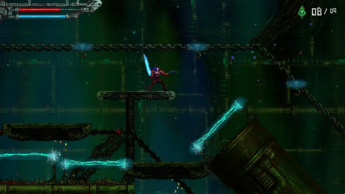На правой стороне большой конструкции с люком прыгайте вниз и через восходящие платформы. Меч-скеллингтон (sword skellington) и ракетная башня (rocket turret) охраняют Кровавый Метал. Следите за электричеством вокруг.