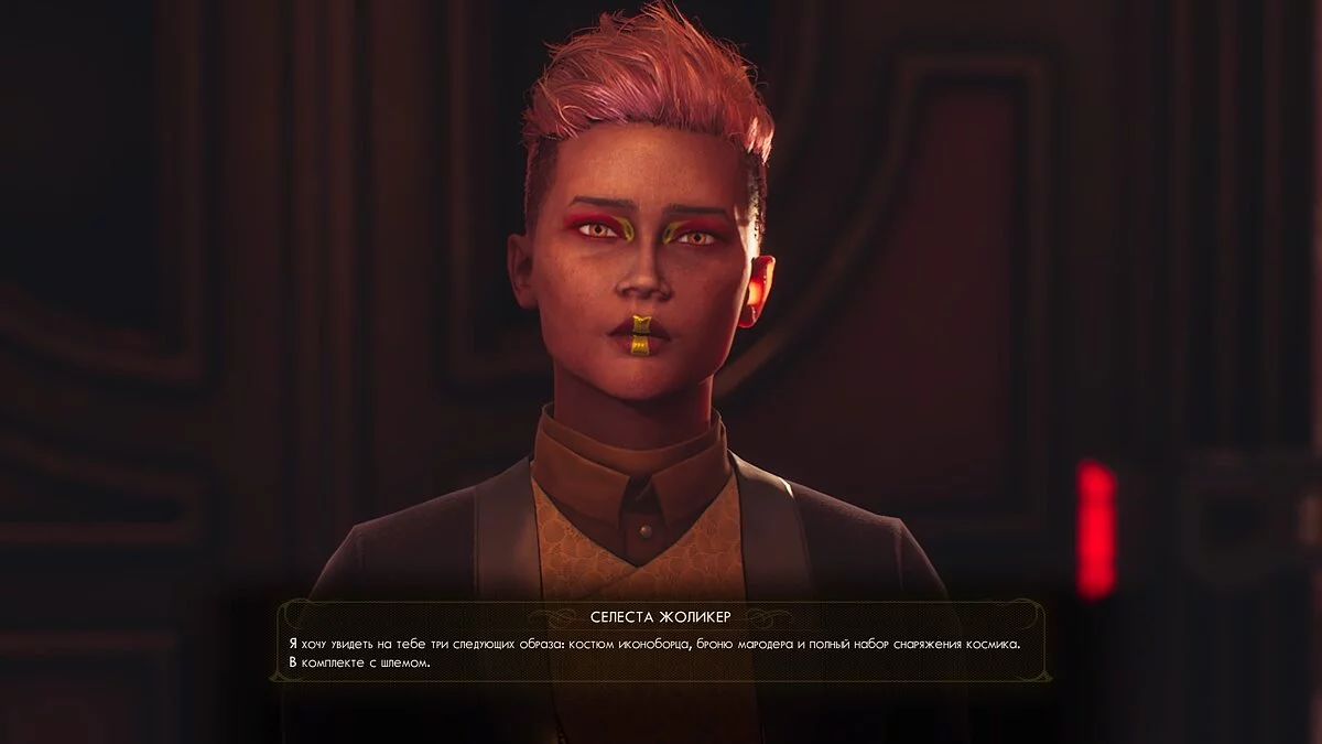 «Шьет скафандры — не готова путешествовать». Квест можно взять в бутике Селесты Жоликер. Она попросит найти три комплекта одежды. Мародеров и космиков можно найти в окрестностях Эджуотера. Иконоборцы живут на Монархе.