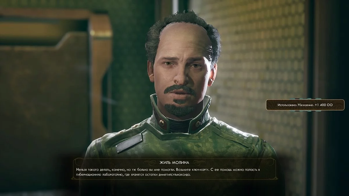 На терминале будет информация о нужных Финеасу химикатах. Отправляйтесь по маркеру в лабораторию. Внутри постарайтесь разыскать Жиля Молину, он согласится отдать ключ-карту ко входу в лабораторию. В итоге у вас будет выбор какое количество химиката взять. Это решение влияет на концовку: возьмете все — погибнут подопытные, но удастся разморозить всех ученых с «Надежды» и наоборот.