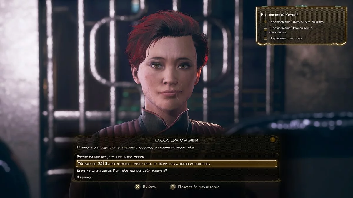 Когда разберетесь с раптидонами и договоритесь с охраной, можно будет выпускать Кассандру. Обойдите ее клетку с обратной стороны и примените ключ-карту Портера. Выбейте из нее документы Крейна и дополнительную награду.