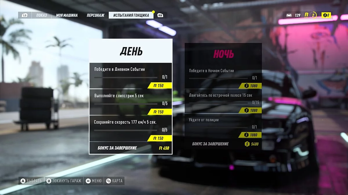 Важно! Днем вы зарабатываете деньги, а ночью репутацию. Деньги нужны для покупки новых машин и апгрейдов, репутация — для продвижения по сюжету.