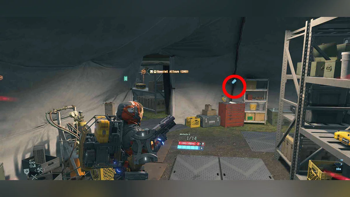 В лагере мулов (MULE camp) на полпути между Эвобиологом (Exo-devo Biologist) и UCA-41-011: Хиральный ретранслятор (UCA-41-011: Potential Chiral Relay Construction Site).