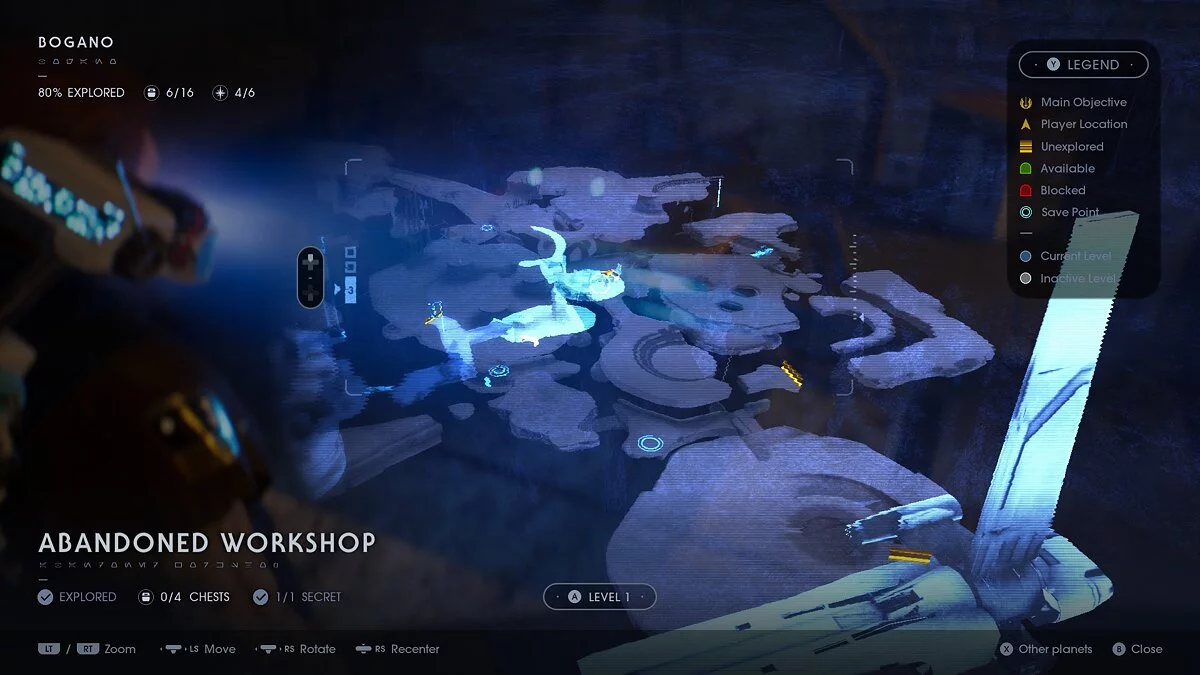 На Богано (Bogano) отправляемся в заброшенную мастерскую (Abandoned Workshop). Стоит отметить, что вы не сможете попасть сюда во время первого посещения Богано. Вам нужна способность Тяга силы (Force Pull), которая понадобится для доступа к мастерской.