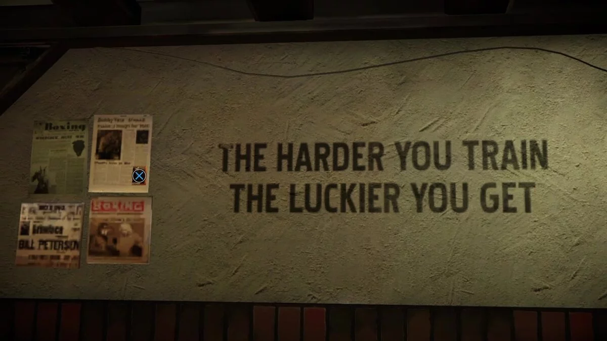 Выходите в зал, подберите наклейку (6) на письменной доске. Далее пройдите в конец зала, найдите надпись The harder you train и осмотрите ее, чтобы взять еще одну наклейку (7).