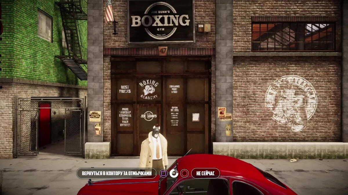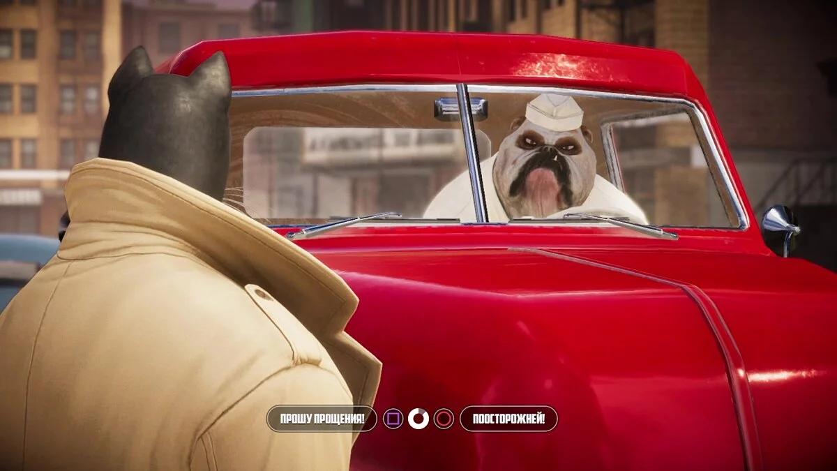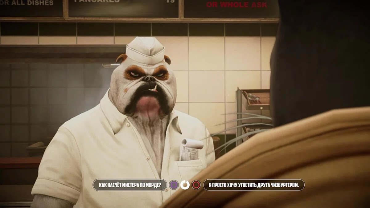 Машину пока не трогайте, а пройдите по улице вправо. Неожиданно героя чуть не собьет хамоватый бульдог на красной машине. Это Сэм, хозяин закусочной имени себя. Если хотите впоследствии получить достижение «Достойный отпор», то не извиняйтесь, а нагрубите ему.
