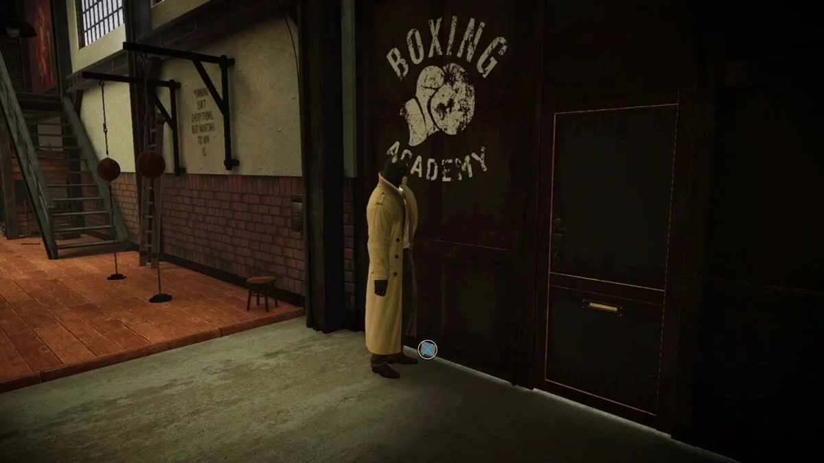 Подойдите к рингу и осмотрите веревку, на которой повесился Данн, чтобы открыть улику. Рядом на одной из колонн заберите наклейку (3). Осмотрите банку краски (улика про следы в клубе).