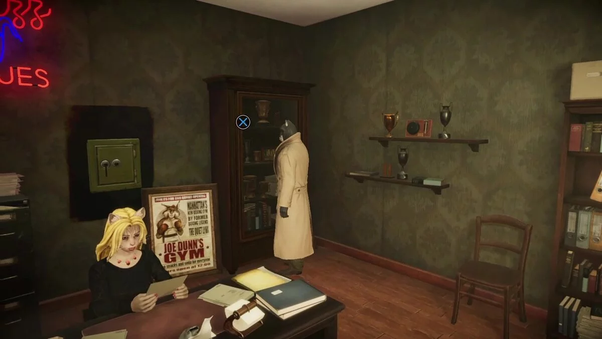 Вернувшись к Соне, детективу придется как-то оправдываться. К сожалению, ни один из доступных вариантов не убедит Соню, и она все равно останется недовольна. Осмотрите шкаф и стену с поясами, найдете две наклейки. Так же в кабинете есть фотография Сони с матерью, а еще можно выглянуть в окно офиса. Зайдите снова в режим детектива и обратите внимание на глаза новой хозяйки клуба, а также на ее грудь в районе сердца — Блэксад каким-то образом определит ее сердцебиение. Так же осмотрите карточки с информацией о сотрудниках, которые стоят на столе.