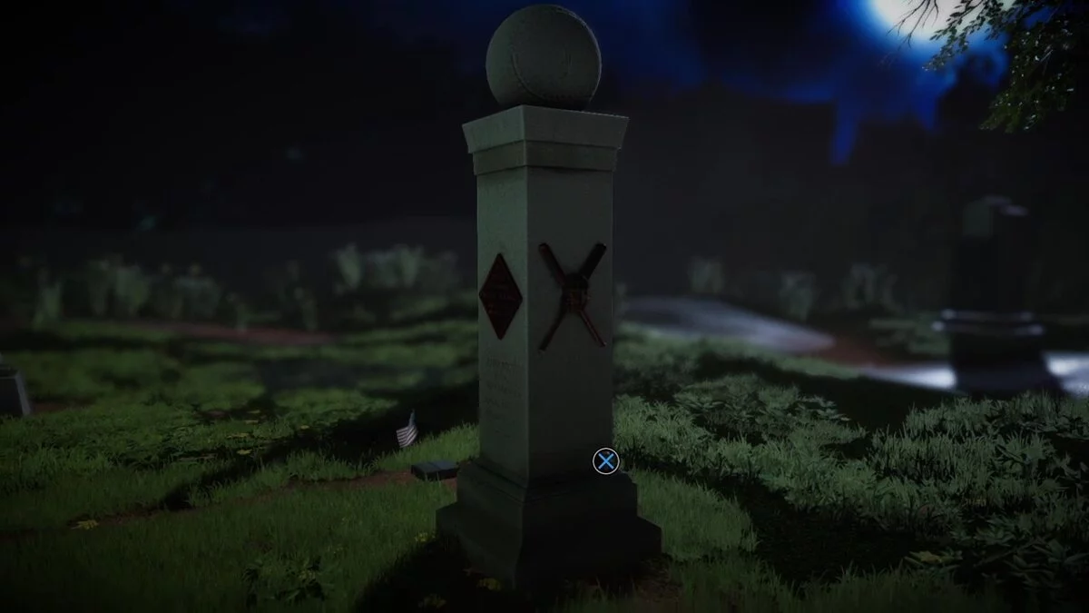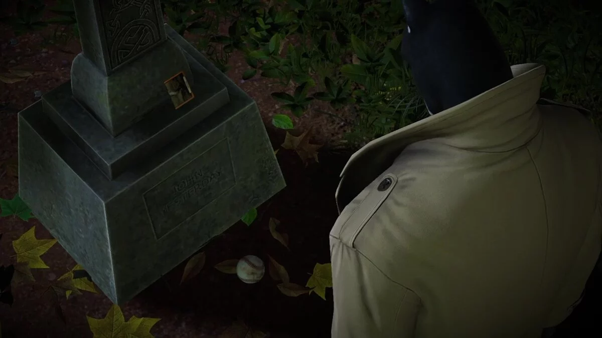 На кладбище нужно осмотреть несколько могил. Найдете четыре наклейки. Подберите также бейсбольный мяч и осмотрите коробку с китайской лапшой, которая валяется недалеко от дерева, чтобы продвинуться далее по сюжету.