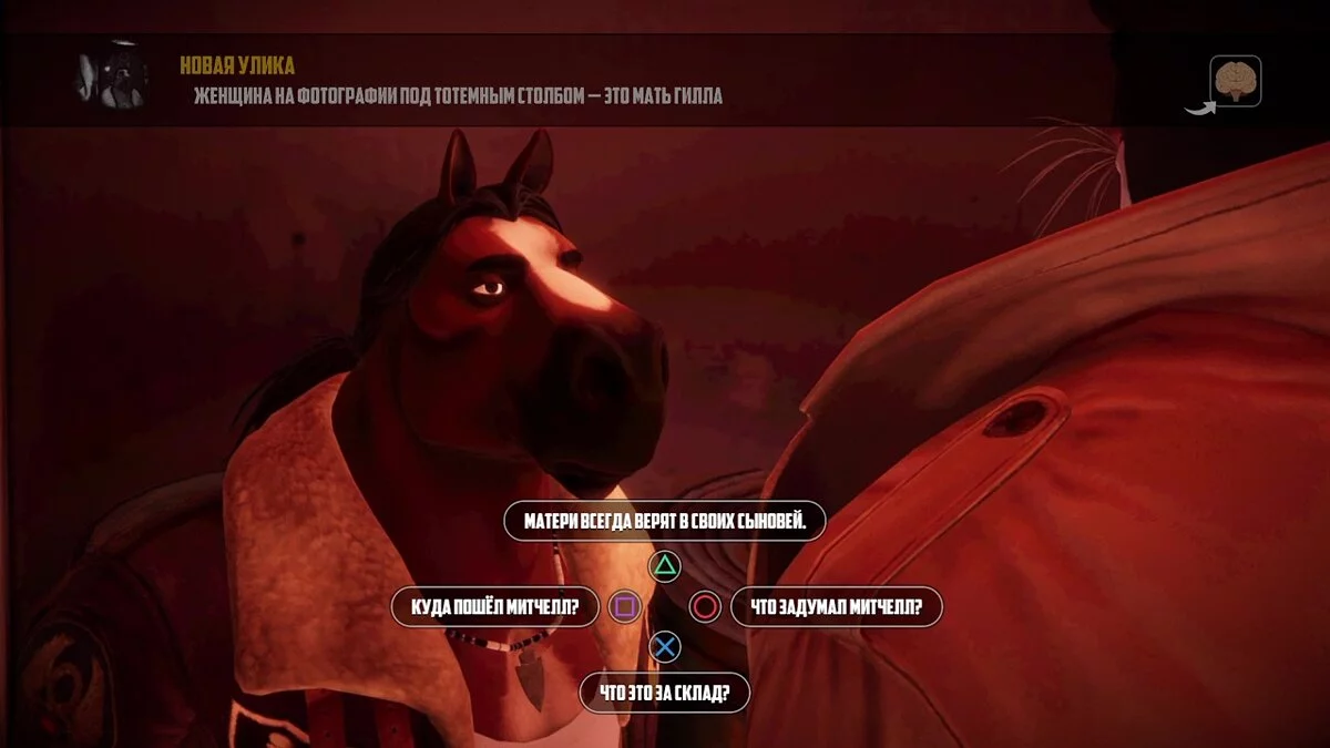 Осмотрите его шею, а частности амулет с наконечником стрелы. Сопоставьте улики «Конь, который работает на Митчелла, носит на шее наконечник стрелы» и «На складе в порту есть чердак, набитый индейскими предметами». После этого начните разговор фразой «Матери всегда верят в своих сыновей». Дальнейшие фразы значения не имеют.
