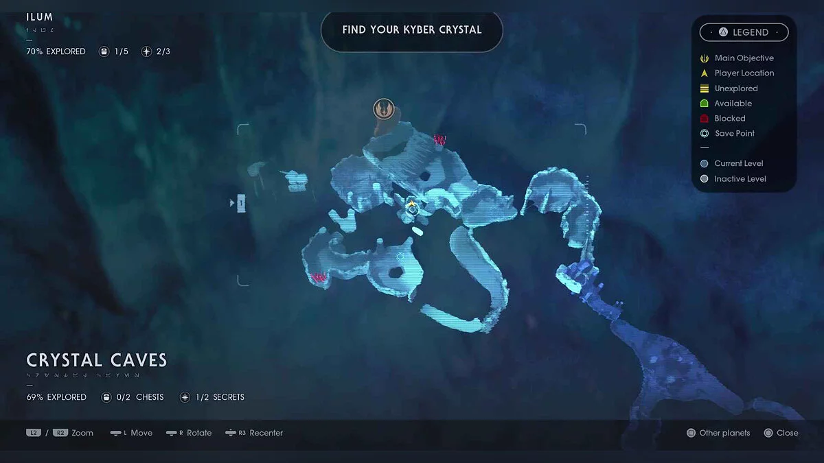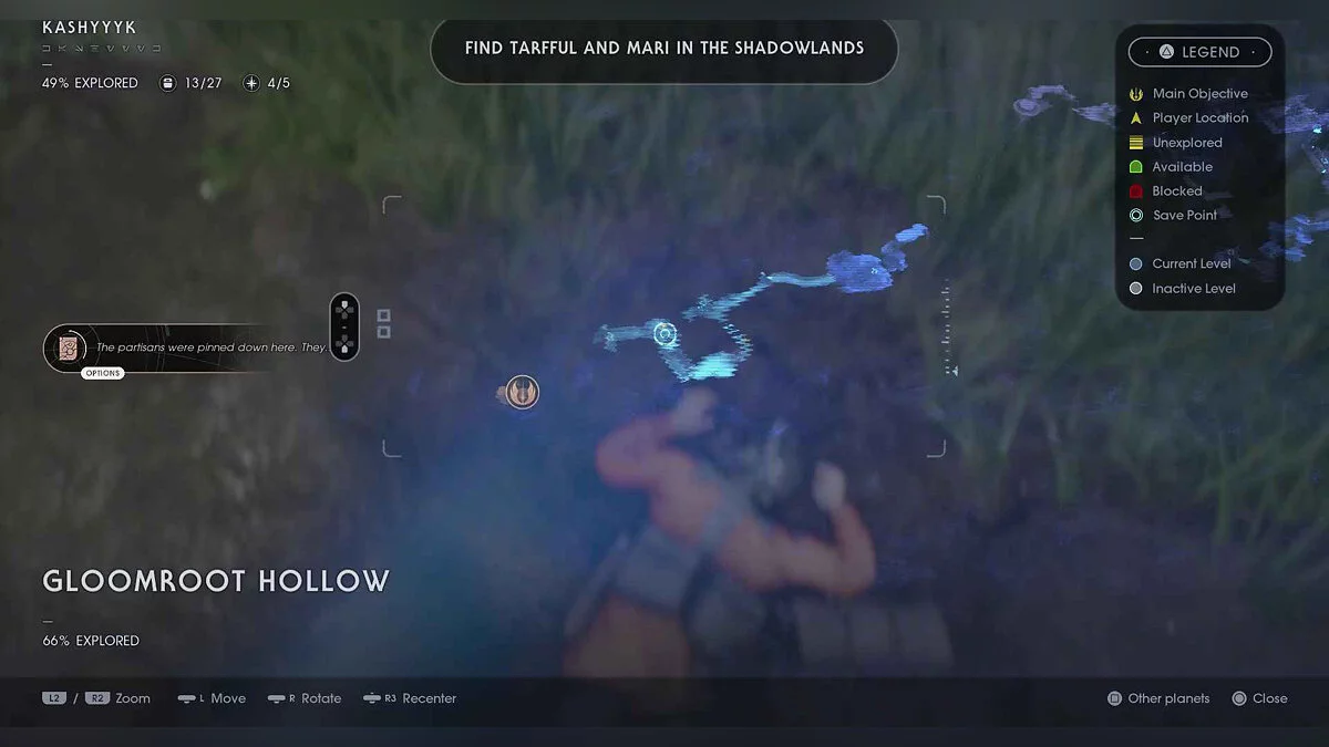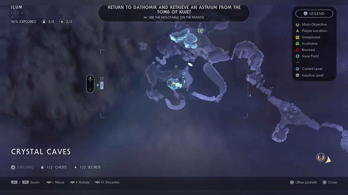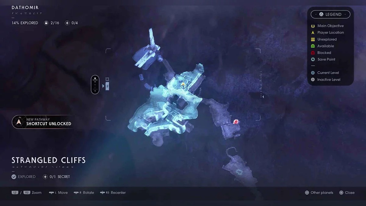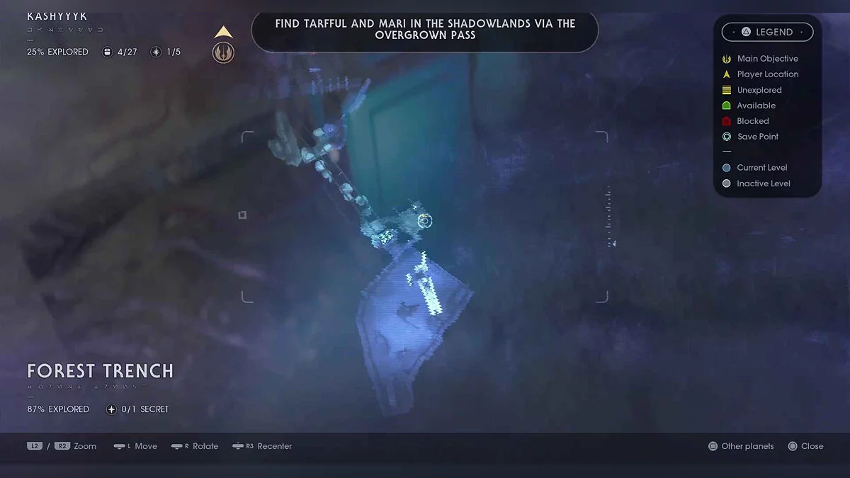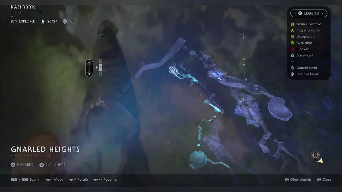 Отзвук Силы #63 — Imperial Occupation — 2. Wyyyschokk Attack (Секрет #22) — от точки медитации в этой области не спускайтесь туда, где сражаются противники. Вместо этого оставайтесь на верхнем уровне, а в левом заднем углу найдите вход в темную пещеру.