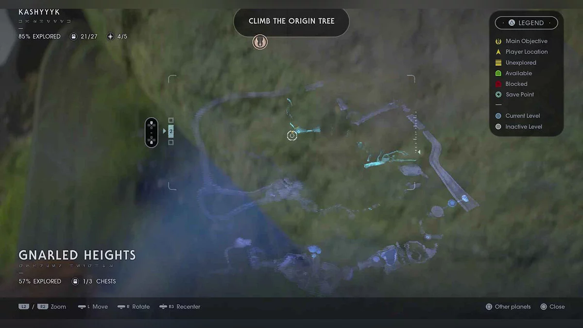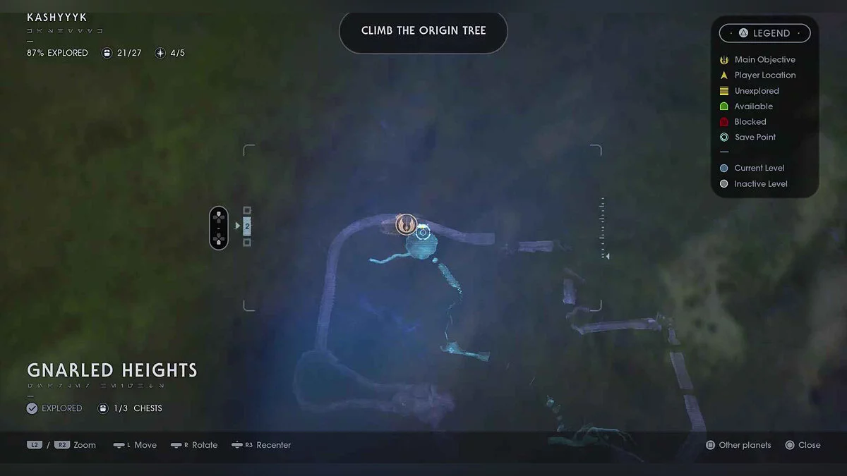 Отзвук Силы #97 — The Nightsisters — 2. Rituals — от предыдущего предмета спрыгните с уступа влево, бегите налево и прыгайте на ветку. На платформе в конце будет предмет.