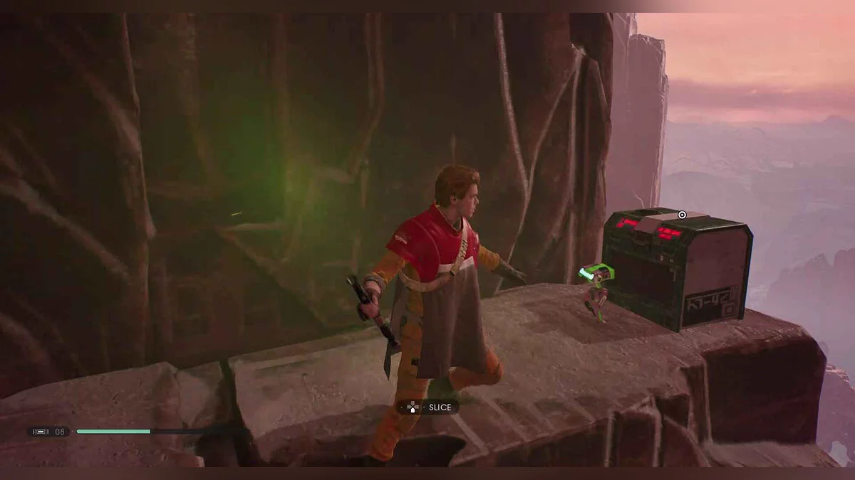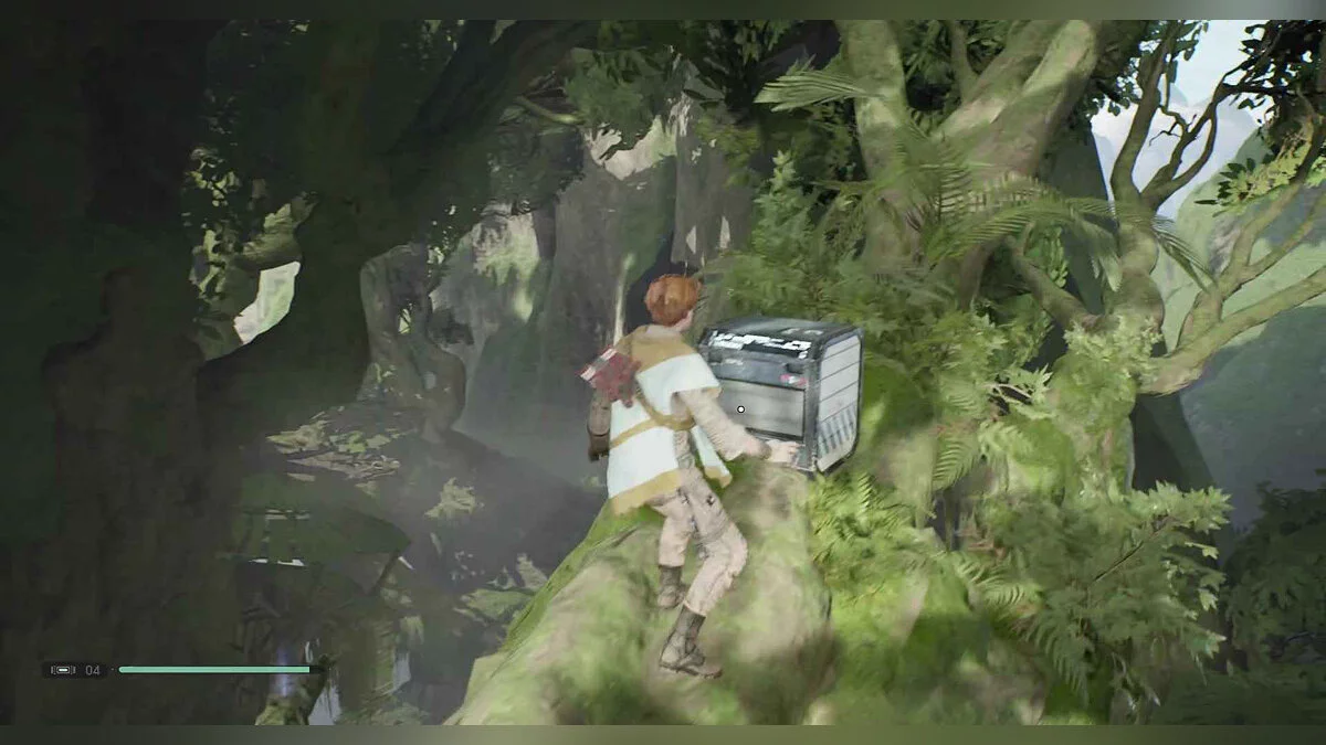 Отзвук Силы #112 — The Gathering — 4. Youngling Afraid — поднимитесь по трапу позади этого сундука и бегите по стене к платформе. Спрыгните на другую платформу, а затем на стену для скалолазания, но вместо того, чтобы взбираться наверх, спуститесь на небольшой выступ с предметом.