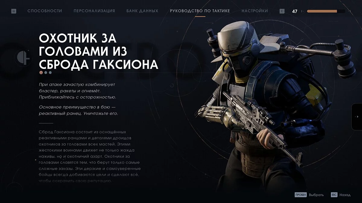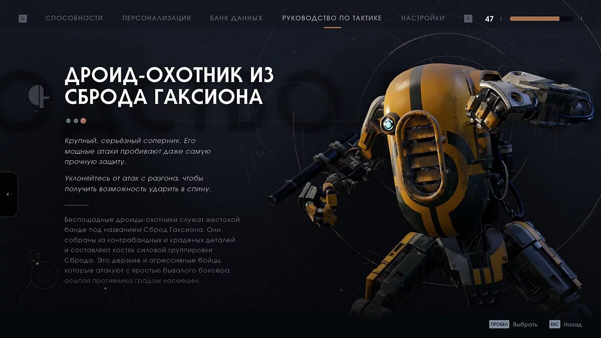 Всего в Star Wars Jedi: Fallen Order есть три типа охотников за головами Сброда Гаксиона, с которым вы будете сталкиваться: Охотник за головами (Bounty Hunter), Коммандос (Commando) и Дроид-охотник (Bounty Droid). Самый лёгкий из них первый.
