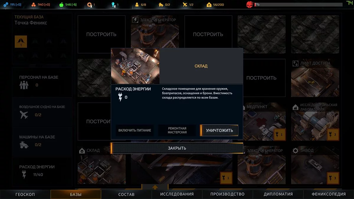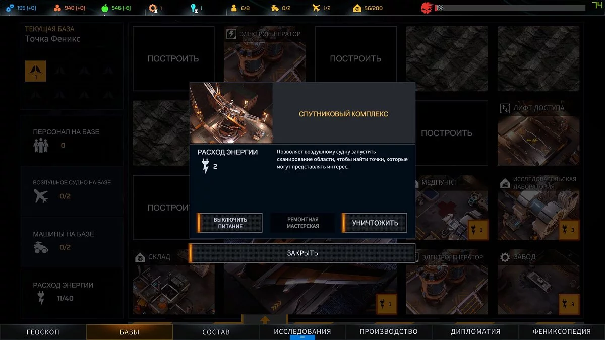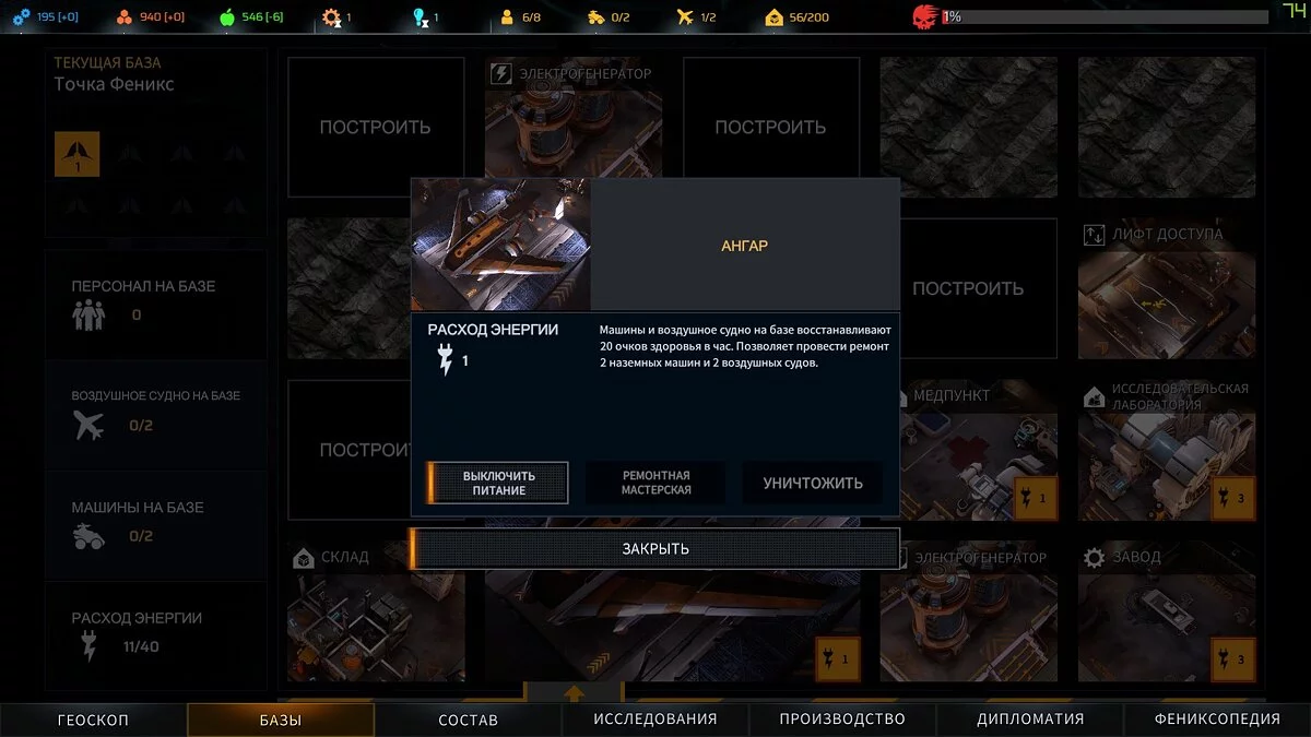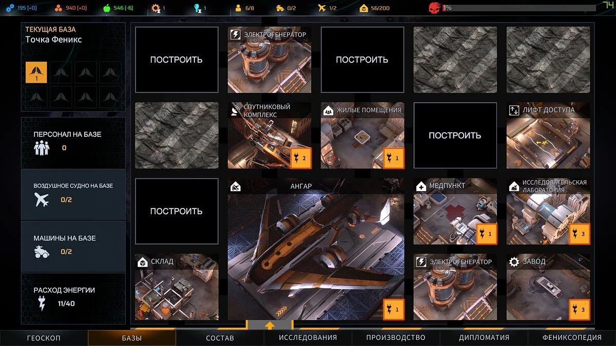Просмотреть все свои Точки Феникса можно во вкладке «Базы» (Bases). Все они поделены на клетки (всего их 20 штук), на каждой из которых может быть построен какой-нибудь комплекс (за исключением Ангара, который не может быть построен самостоятельно).