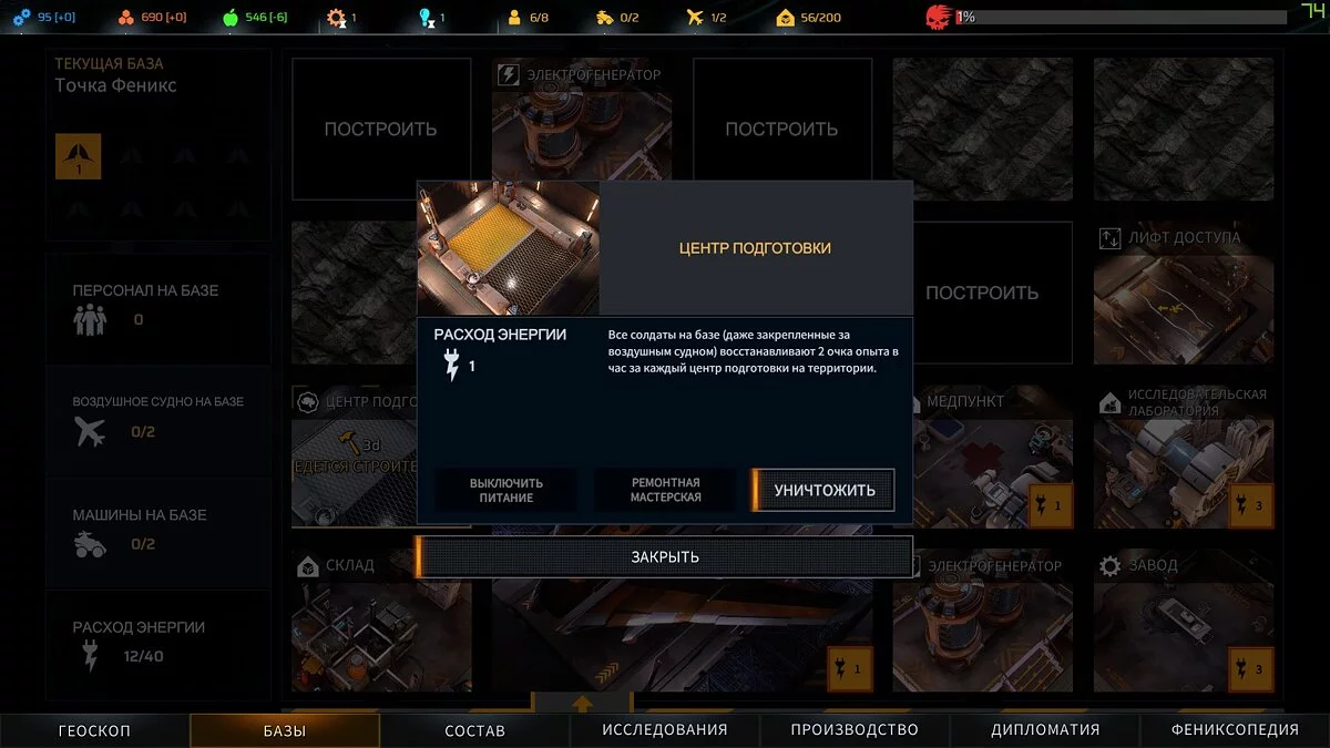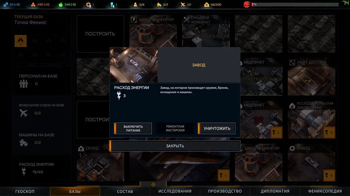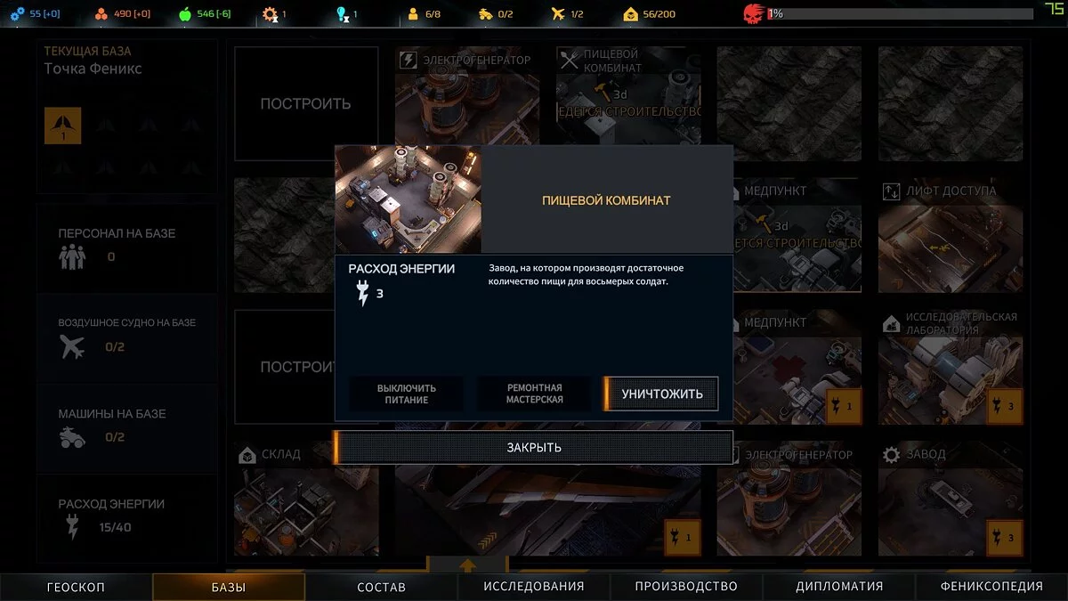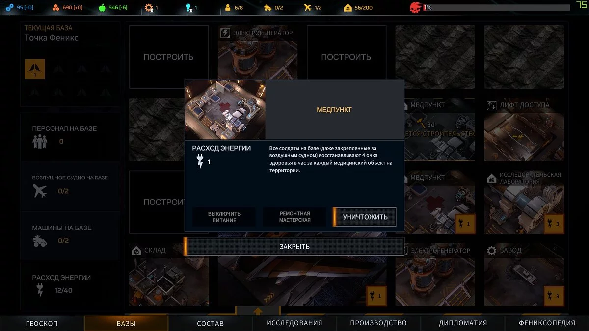 Просмотреть все свои Точки Феникса можно во вкладке «Базы» (Bases). Все они поделены на клетки (всего их 20 штук), на каждой из которых может быть построен какой-нибудь комплекс (за исключением Ангара, который не может быть построен самостоятельно).