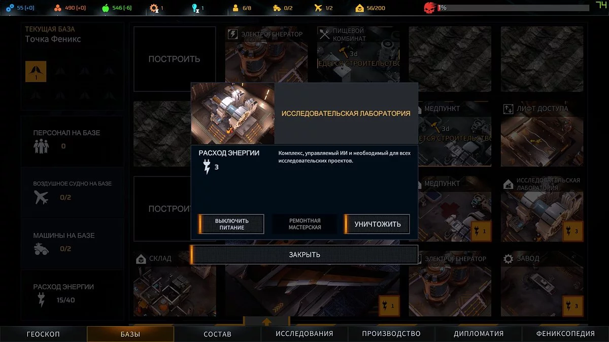Оставаясь лишь с одной «Исследовательской лабораторией» вы рискуете навредить общему росту организации. Однако уже встроенного в базу комплекса будет достаточно для дальнейшего исследования, хоть и сам процесс будет не очень быстрым.