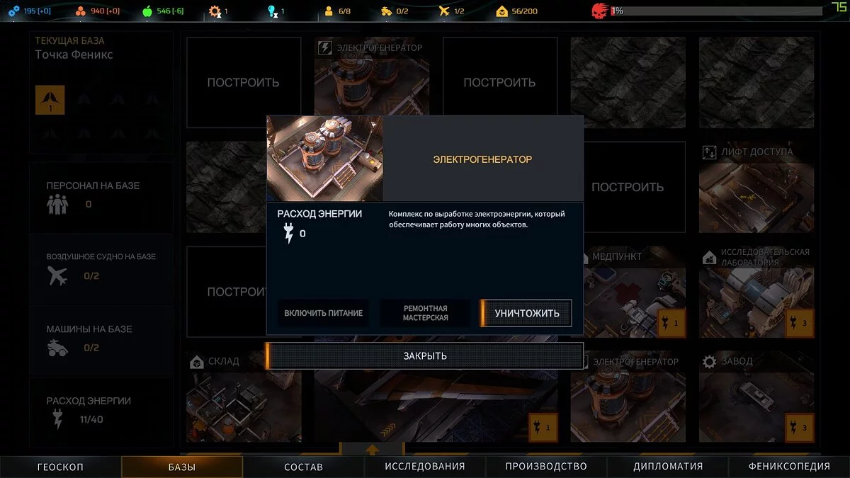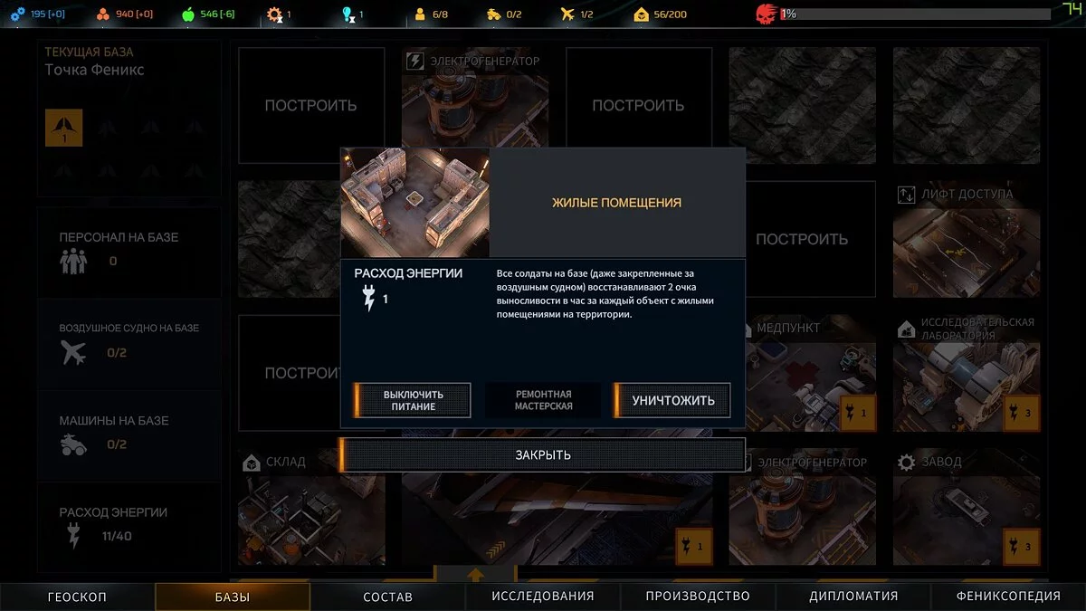 Всего в Phoenix Point для строительства доступно двенадцать зданий. Все они стоят определённое количество материалов и технологий, а также требуют время на возведение. Помимо этого, для работы некоторых комплексов требуется энергия. Это значит, что вам необходимо поддерживать энергоснабжение базы, создавая «Электрогенераторы» когда это будет необходимо.