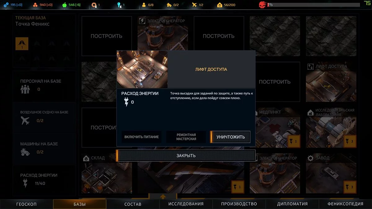В Phoenix Point есть достаточное количество комплексов, функция которых — это удовлетворение определённых потребностей. И как только эта потребность будет удовлетворена, больше вспоминать о таких строениях вам не придётся. Например, это касается «Электрогенератора» (Energy Generators), «Лифта доступа» (Access Lift) или «Жилого помещения» (Living Quarters). Но вопрос в другом: что следует возводить после того, как все эти потребности были удовлетворены?